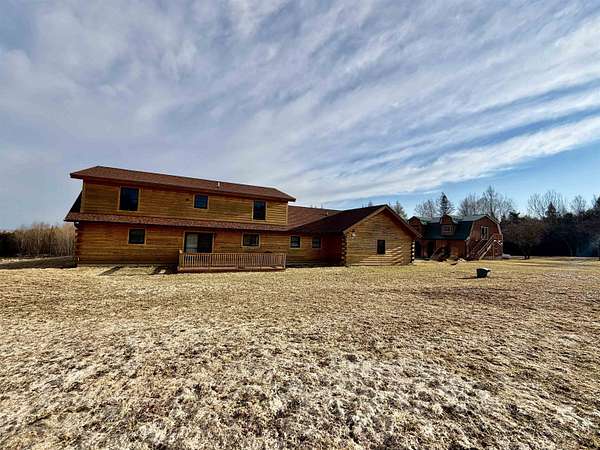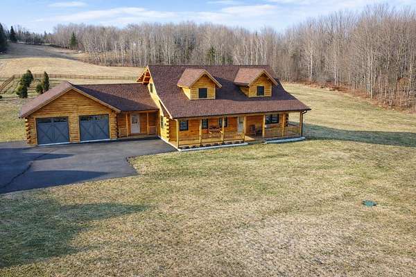 Striking post-and-beam log home set on 64.91 acres of a beautiful mix of open and wooded land, complete with an oversized 4-bay detached garage, and workshop. Built in 2022 and finished in 2023, this thoughtfully designed property offers 3 bedrooms, 3 bathrooms, a loft, and an attached 2-bay heated garage. The main level features a functional mudroom/laundry area connecting the garage to the home, leading into an open-concept kitchen, dining, and living space ideal for everyday living and entertaining. The primary suite is also located on the main level and includes a walk-in closet and a tiled shower. Upstairs, you’ll find two additional bedrooms, a full bathroom, and a versatile loft area overlooking the main living space. Radiant heat powered by a propane boiler, along with a propane stove in the living room, ensures year-round comfort. Additional highlights include 200-amp electrical service, a shared drilled well, and a private septic system. Enjoy long-range views from the covered porch overlooking a pond (approximately 6–8 feet deep). The land offers exceptional usability, with approximately 20 acres of open field that is easily accessible—perfect for recreation, farming, or animals. Above the detached garage, a heated and finished space provides a kitchen, bathroom, and office area, offering excellent potential for guest quarters, workspace, or additional living space. Outdoor enthusiasts will appreciate direct access to the VAST and VASA trail systems right from the property. Schedule your private showing today and experience everything this home has to offer.