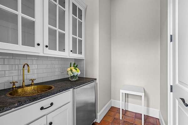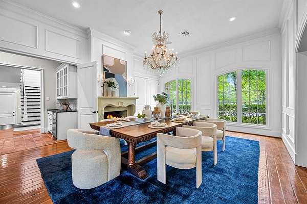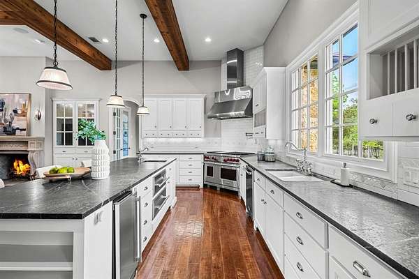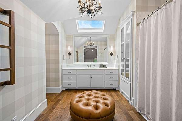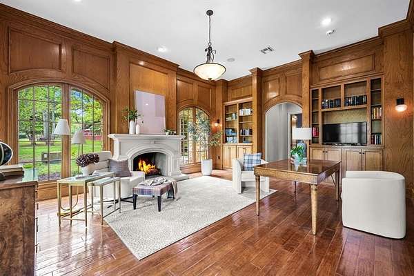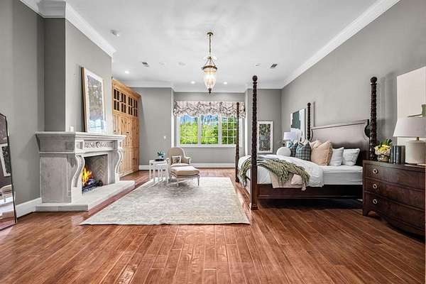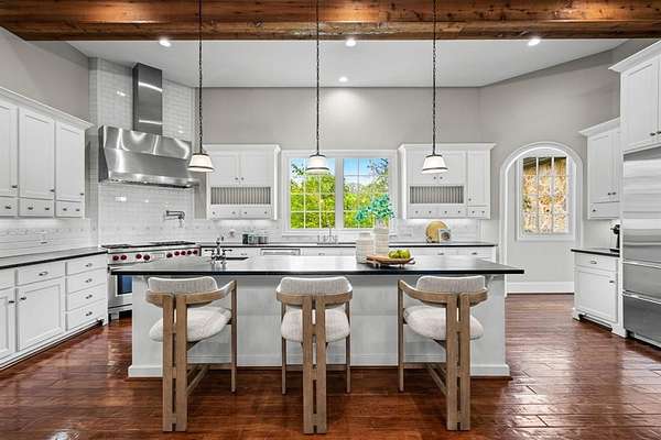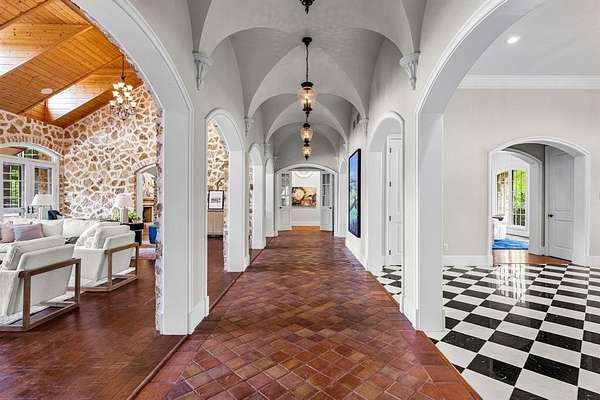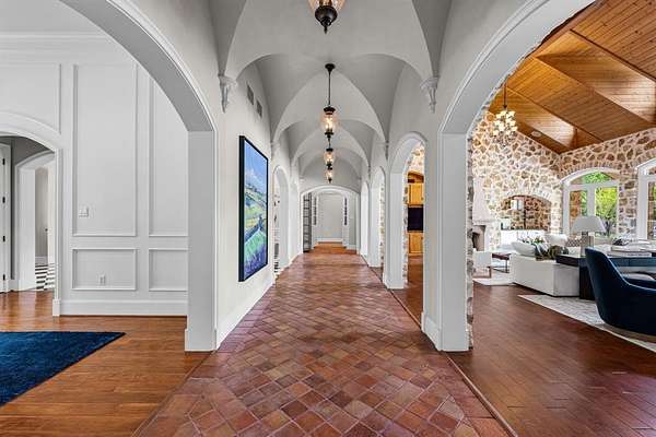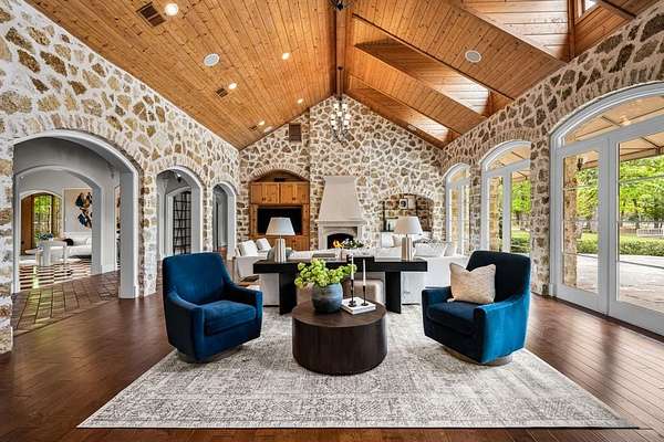 The main residence spans 8,355 sqft & is rich in character, showcasing curved archways, exposed brick accents, hand-scraped hardwood floors, soaring ceilings, & 6 wood-burning fireplaces that create warmth throughout. Designed for both everyday living & entertaining, the home offers multiple living areas, a chef’s kitchen with butler’s pantry, & architectural details that feel both elevated & welcoming.