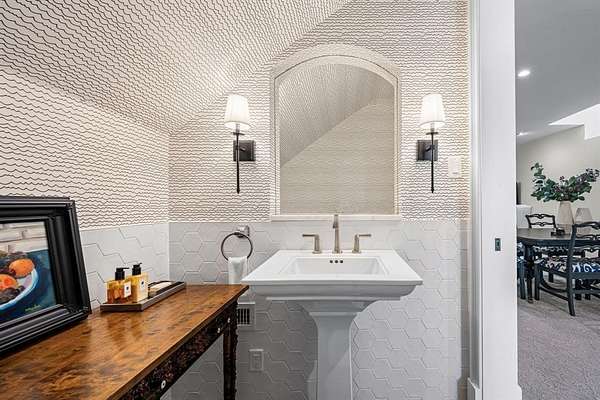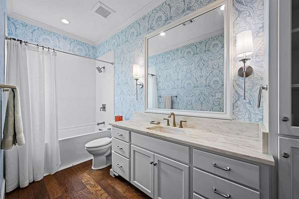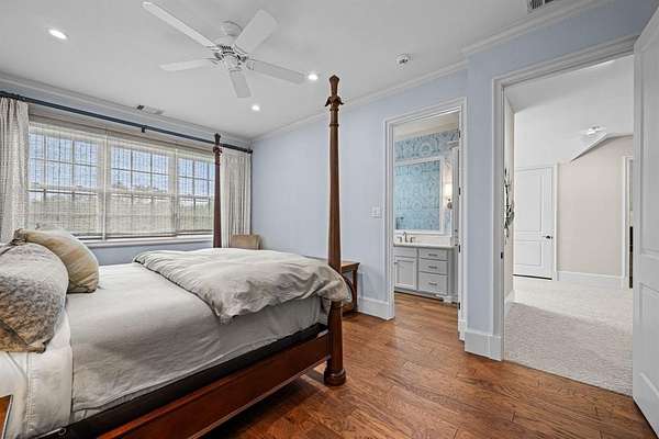 The expansive primary suite offers a private retreat with a spa-inspired bath featuring a walk-in shower, soaking tub, dual vanities, generous his-and-her closets, & a wet bar. The current owner expanded the home to include 2 additional bedrooms with en-suite baths & a spacious den with bar area, ideal for multigenerational living or extended guest stays.