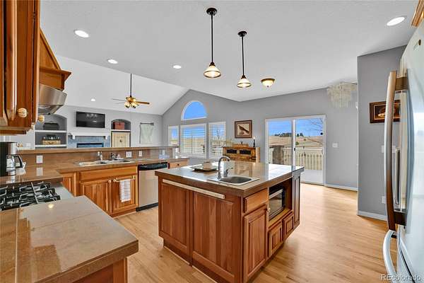 The residence is warm and functional, featuring vaulted ceilings, hardwood floors, and two gas fireplaces. A country kitchen anchors the home, while the main-level primary suite, additional bedrooms, and loft provide everyday comfort. The finished walk-out basement offers flexible space for guests, an office, or separate living quarters.