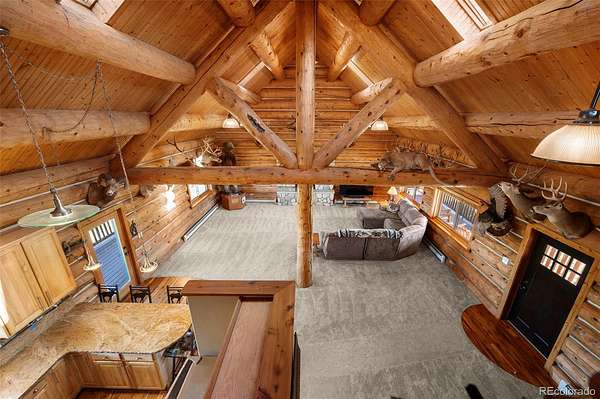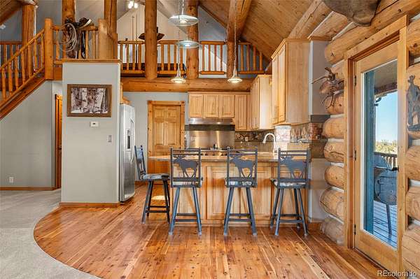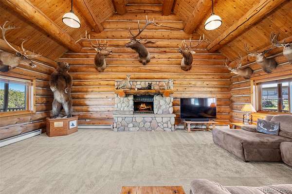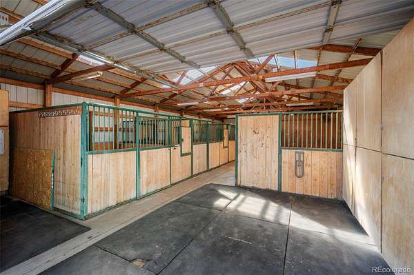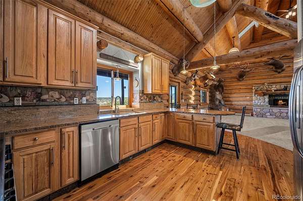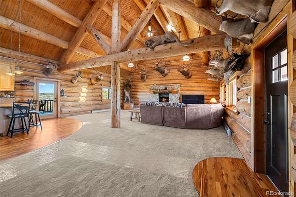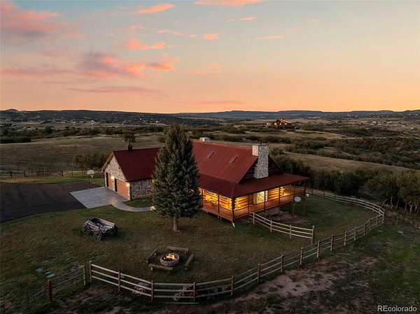 Nestled at the base of the Rocky Mountains, this breathtaking 35-acre estate offers 360° scenic views, abundant wildlife, and privacy rarely found so close to town. Built to harmonize with the land, it embodies the Colorado lifestyle where luxury meets nature. Trophy elk and deer roam freely, and a private shooting range makes this a hunter’s paradise. The sprawling 5-bed, 4-bath lodge-style home offers 4,760 SF of finely crafted living space. Inside, you’ll find vaulted ceilings framed by hand-peeled logs, Australian cypress flooring, imported granite, and knotty pine cabinetry evoking the rustic elegance of Yellowstone Ranch. An open floor plan, chef’s kitchen, and wrap-around redwood deck create the perfect setting for relaxing or taking in endless Colorado skies—unspoiled and full of stars. The main level features a primary suite with ensuite bath, plus an additional bedroom + bath; the second level includes a loft with another bedroom + bath. Designed for multigenerational living, the lower-level walkout has a private entrance, two bedrooms, bath, full kitchen, living area, and covered porch—ideal for family, rental income, or ranch-hand quarters. CCRs allow an additional custom home. The ranch includes a 6-stall barn attached to an indoor riding arena with heated viewing area, plus a separate 6-stall barn with lounge and tack storage. All stalls have auto waterers. Additional amenities include a large outdoor arena, two round pens, covered hay storage, and ample trailer and guest parking. Equestrians will appreciate the Douglas County Use Permit allowing licensed boarding for up to 12 horses, with no county limits on personal horses. Excellent well with irrigation system. Just 10 minutes west of Castle Rock in the Douglas County School District, this exceptional property offers the perfect balance of privacy and accessibility—ideal for family living, equestrian pursuits, or a luxury ranch retreat. A rare opportunity to own a piece of true Colorado paradise.
