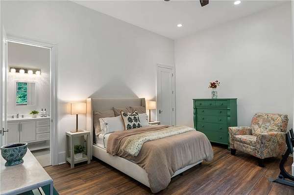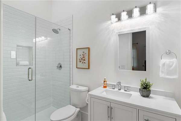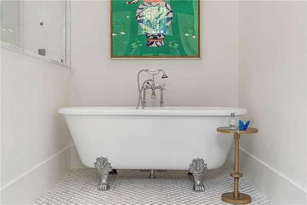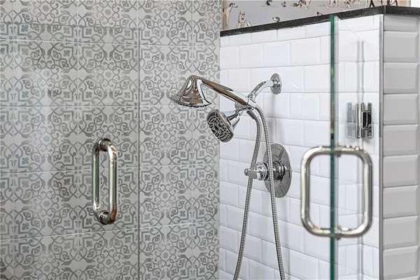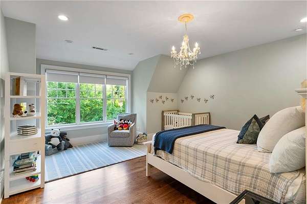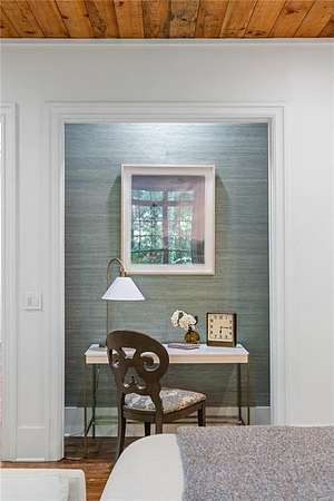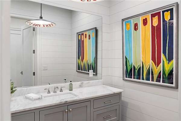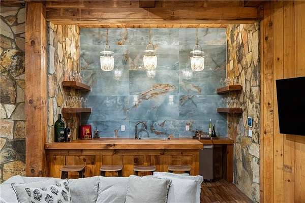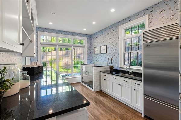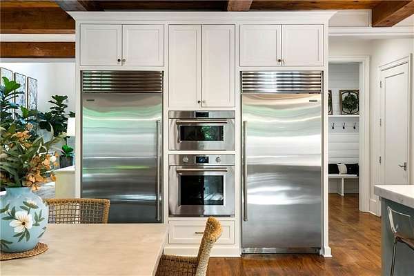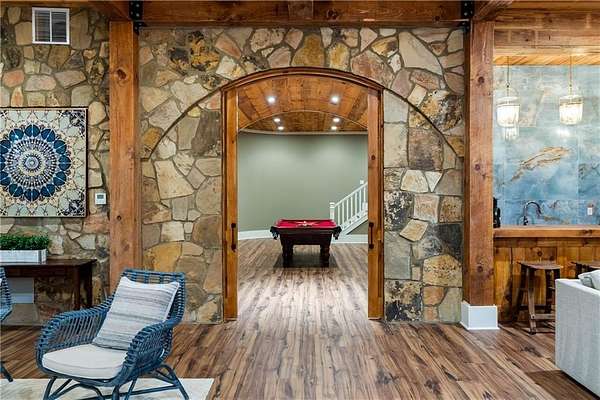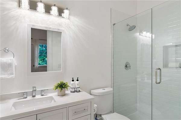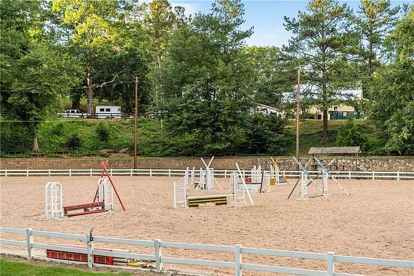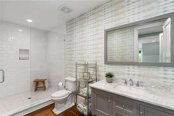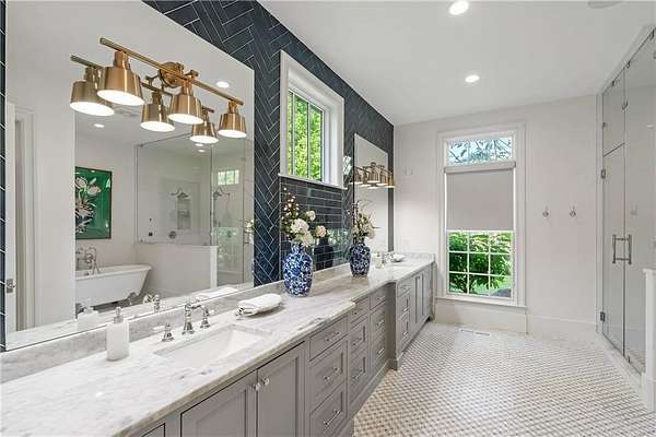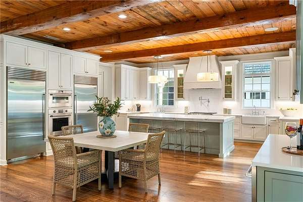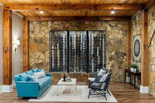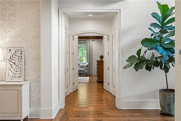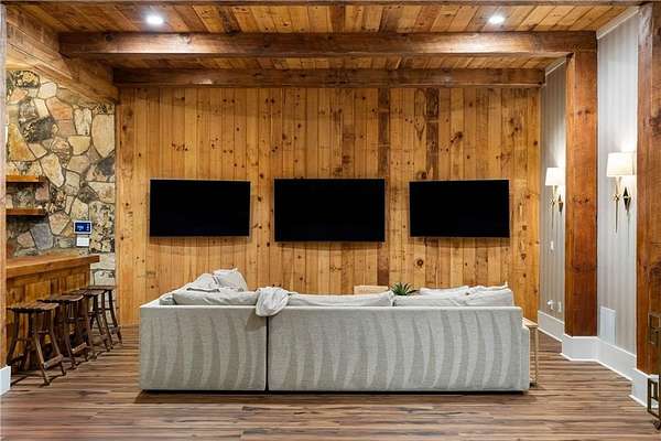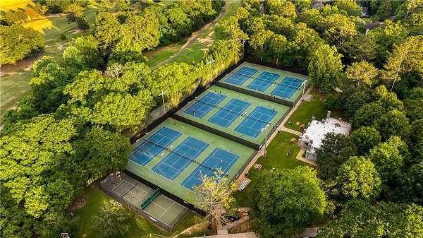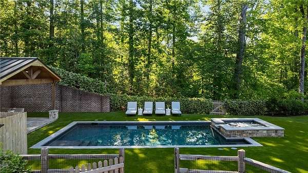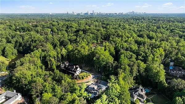 Set within a gated enclave of four custom residences, this newer New England coastal-style home offers rare privacy and luxury in the heart of Sandy Springs, just minutes to Chastain Park, City Springs, and top-rated schools. Tucked 600 feet off the road on over three wooded acres, the home features light-filled living spaces with hand-hewn beams, pine ceilings, and wide-plank hickory floors. The open floor plan is designed for modern living and entertaining, anchored by a chef's kitchen with a Wolf six-burner range, Sub-Zero refrigeration, double ovens, dual dishwashers, two farm sinks, an ice maker, and two walk-in pantries. Sliding doors open from the main-level walk-out to a covered patio with outdoor kitchen, pavilion with wood-burning fireplace, and a heated saltwater pool and spa, creating a seamless indoor-outdoor lifestyle. The main-level primary suite includes a spa bath with steam shower, soaking tub, dual vanities, and a custom closet with center island, plus an adjoining office or sitting room with pocket doors. Upstairs, three ensuite bedrooms surround a central loft ideal for homework, gaming, or lounging. The finished terrace level is built for entertaining with a full bar, glass-enclosed 1,000-bottle wine room, recreation area with three TVs for sports viewing, a home gym, and two ensuite bedrooms perfect for guests, in-laws, or an au pair. Additional highlights include a three-car garage with expandable space above (guest or carriage suite potential), a laundry room with dog wash and dual washer/dryer sets, gas lanterns, shake roof, and layered shiplap and marble finishes. A wall of windows along the rear fills the main level with natural light and wooded views year-round. Located in the sought-after Heards Ferry Elementary and Riverwood International Charter High School district and minutes from Holy Innocents' Episcopal School, this is an ideal location for families wanting proximity to premier public and private schools.