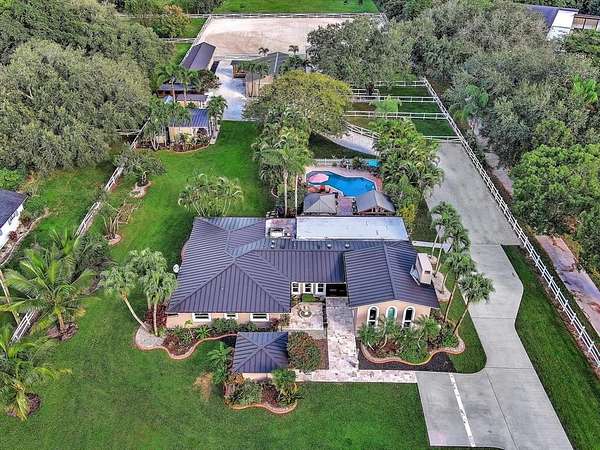 EQUESTRIAN ESTATE IN SUNSHINE RANCHES- one of South Florida's most prestigious communities. This fully renovated 4 bed/3-bath estate offers over 4,700 square feet under air, an in-laws suite cottage, and a 1,620 SF air-conditioned barn/flex building. Natural lighting, new porcelain floors, new impact windows, and a new metal roof. Full video surveillance and upgraded wifi network covering all areas. Outdoor with a resort-style pool, with two gazebos and professional landscaping with a full irrigation system. Private electric gate, complete equestrian facilities with stables, dedicated feed and tack room, paddocks, two wash racks, a half-acre professional riding arena, manure bin, and storage. Property is ready for the highest and best use, combining residential use and business options.