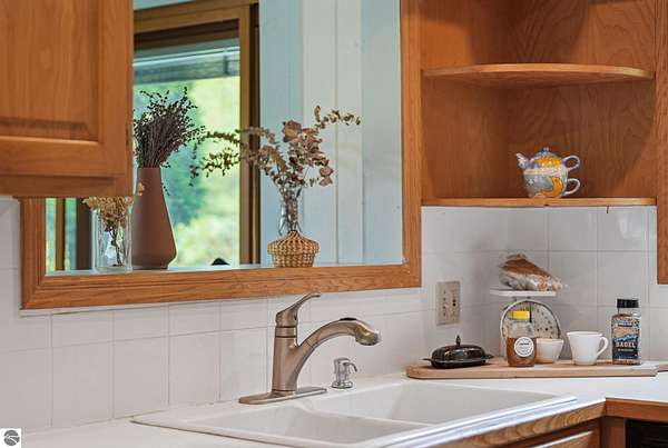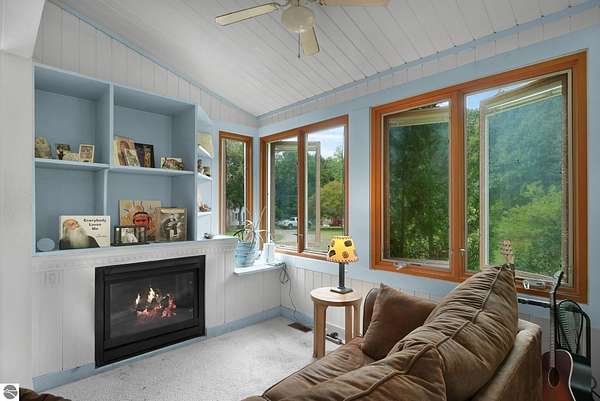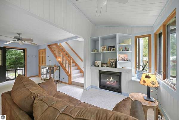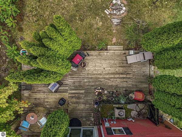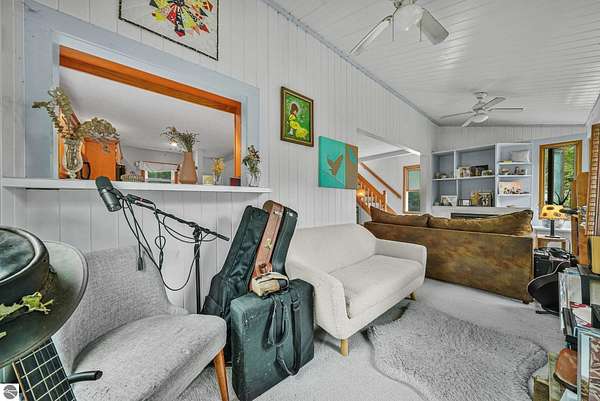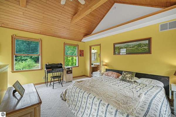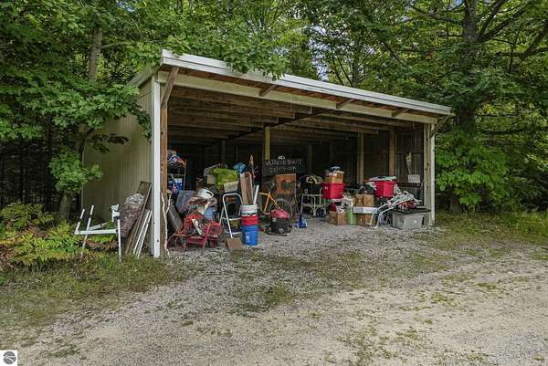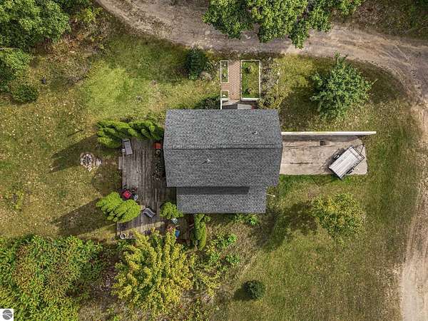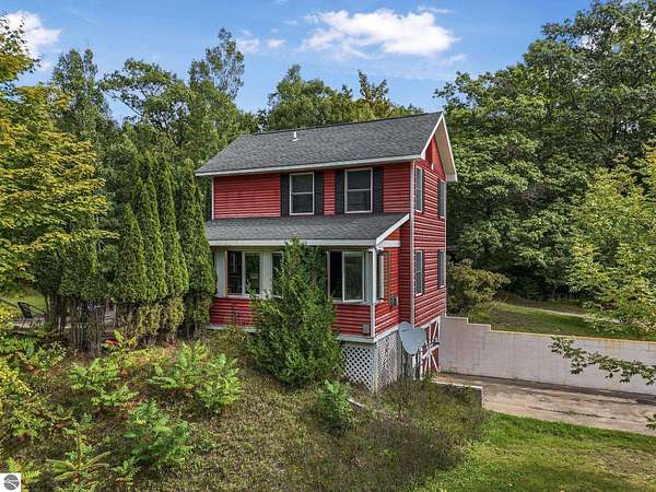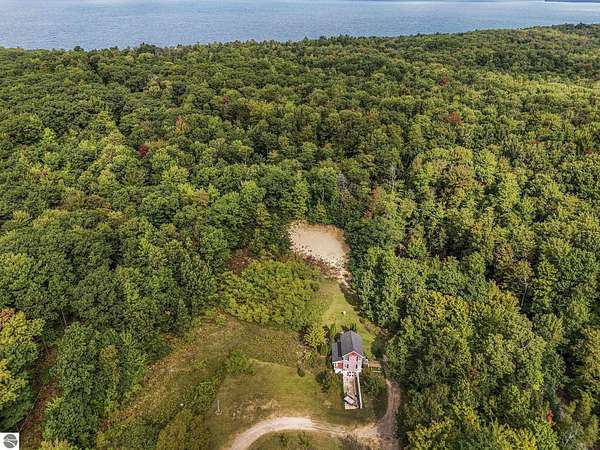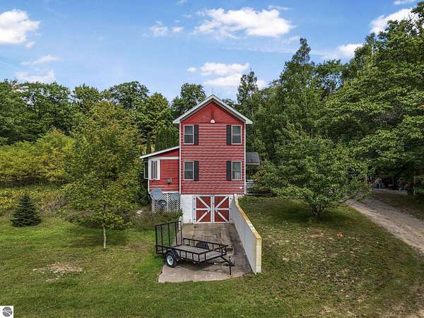 Presenting a unique, elevated farmhouse on 3 acres, just north of Leland! This simple, 1 bedroom / 1.5 bathroom residence is perched at the edge of a beautiful dune-like clearing, and is accessed via shared driveway easement off of scenic M22. The kitchen, living room with fireplace, dining area, and half bathroom are located on the main floor, which opens to a private deck - a delightful location to enjoy views of the yard and take in the sounds of nearby Lake Michigan. Upstairs, the primary bedroom has a vaulted ceiling, clad in wood tongue and groove paneling. This space is bright and cheerful, featuring numerous windows with views of the surrounding dune and woods. A full bathroom and walk-in closet with washer and dryer complete this upper floor. On the lowest level, a workshop and storage area walkout to grade through wooden barn doors. This home is being sold as-is: it is a cosmetic fixer-upper with excellent bones and endless potential, just waiting for your personal touch and updates. Don’t miss your chance to live near beautiful Leland! Full associated documents include an inspection report from Fall of 2025. FOR CLARITY: this property includes the house and lean-to structure. Any other structures shown in the background of any photographs are on the neighboring parcel and are not included in this sale. Adjacent vacant parcel of 6 acres are available for purchase from a different seller - MLS 1939965.