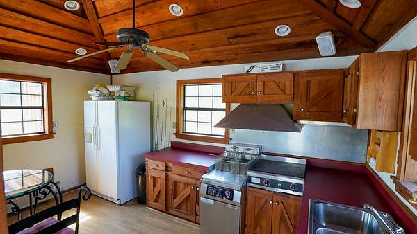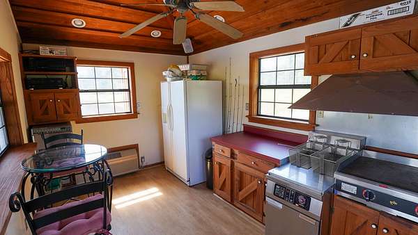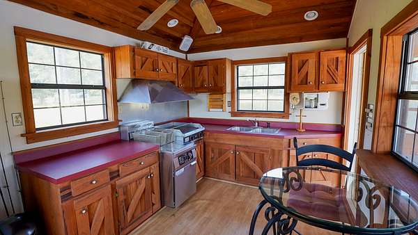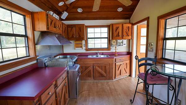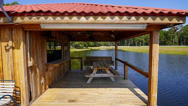 The private lake includes a heated and cooled cottage with a small kitchen over the water, accessible by a pier and dock. Here, you can catch, clean, and cook your fish in one spot--all while watching the big game.