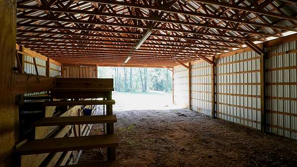 1,858 sq ft livestock barn with stalls, tack room, dirt floor, and fluorescent lighting.