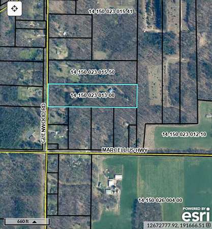 North of Marcellus Highway on the east side, to the sign. Gate will be left open. Take the two-track back to the home.