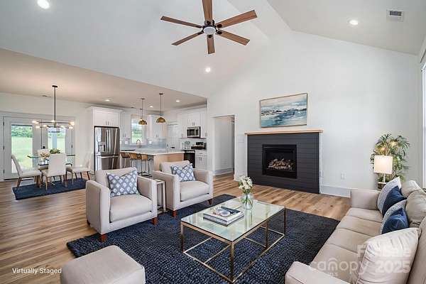 Discover this Semi-Custom New Construction Farmhouse on 2.3+/- acres! This 3BR/2.5BA home boasts 1735+/- sq ft of thoughtfully designed space. Exterior features Hardie Board & Batten siding, cedar-wrapped front porch columns, custom cedar shutters, beadboard front porch ceiling. Inside, enjoy a Large Vaulted Living room w/ gas logs, custom red oak mantle, LVP flooring, an open kitchen with Destin White shaker cabinets, Treasure Chest island, Daltile Golden Gate Quartz countertops, sky-blue backsplash & walk-in pantry w/ Built in Shelving. Spacious laundry includes sink, upper, lower cabinets & granite counter. Primary suite boasts tray ceiling, quartz dual vanities, tile shower with offset sprayer & built-in closet system. Two guest rooms share a full bath. Relax on the large rear covered concrete porch overlooking your oversized lot-Septic has been strategically placed for future pool or detached garage/workshop. Crawlspace has been sealed and dehumidifier installed for peace of mind! Includes 1-year Limited Builder Warranty!