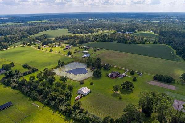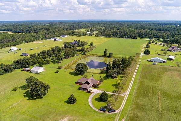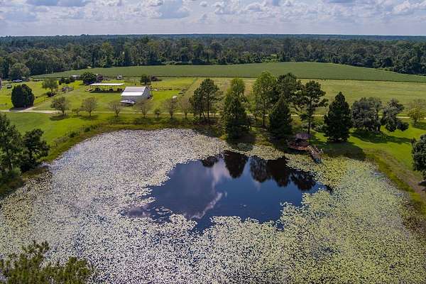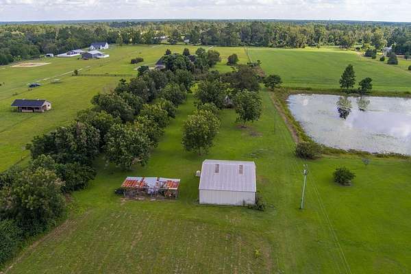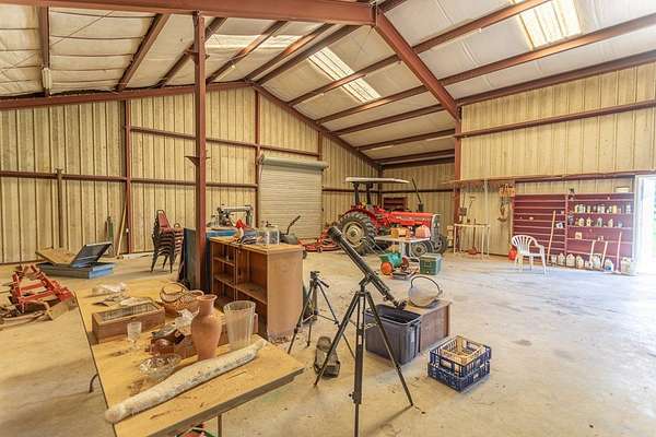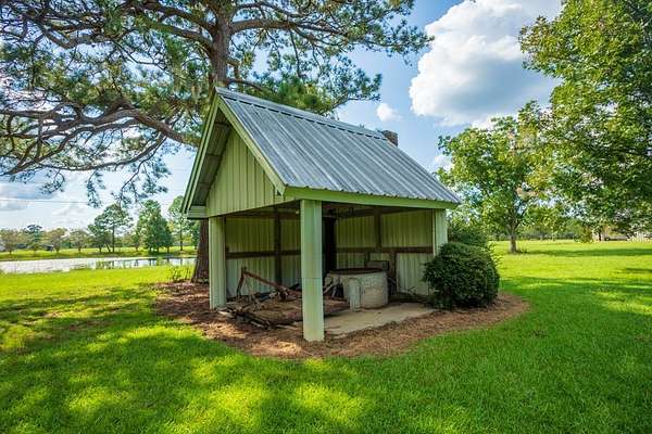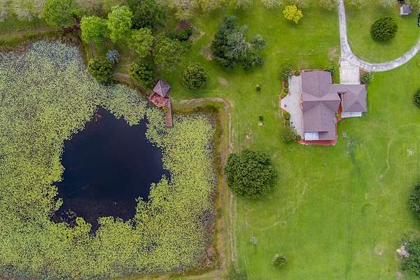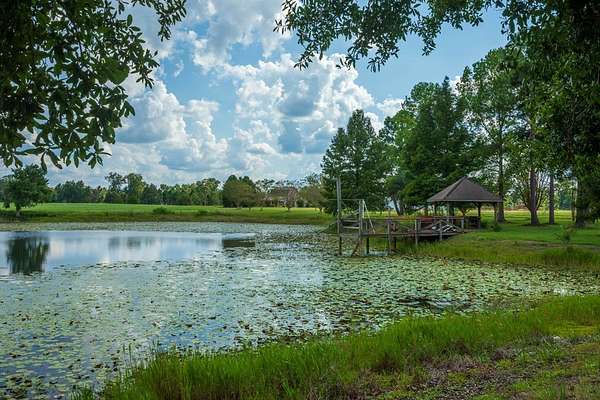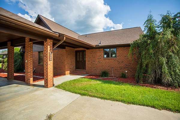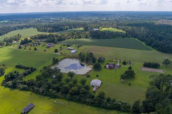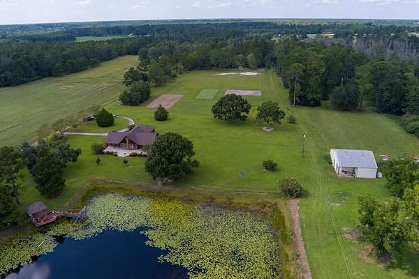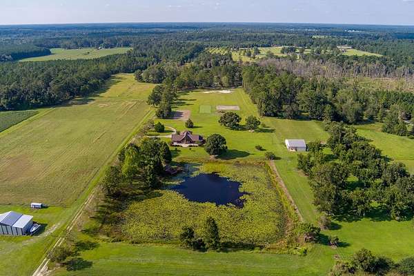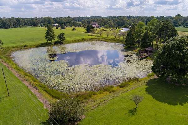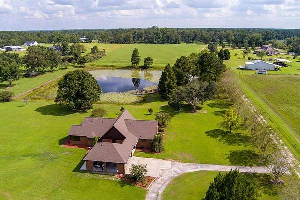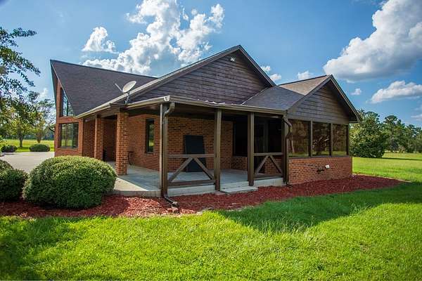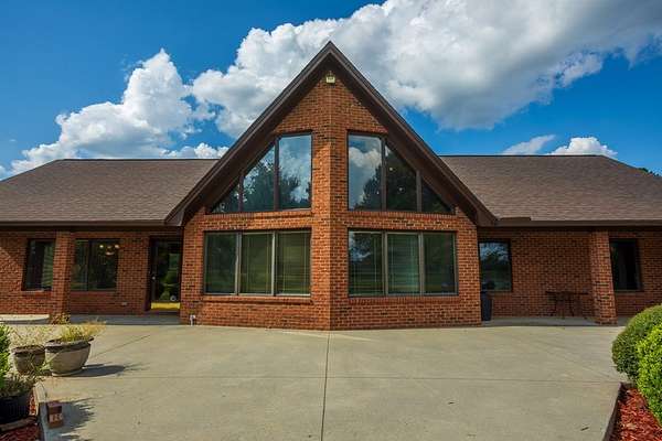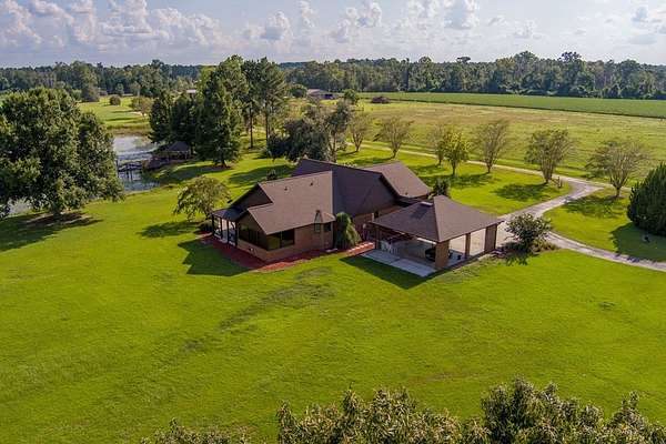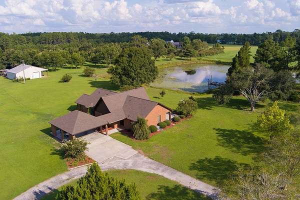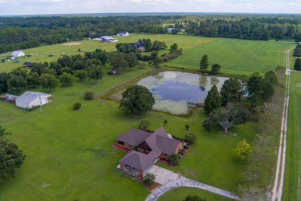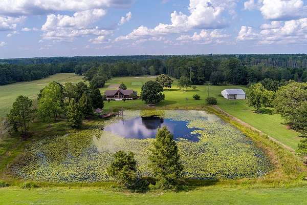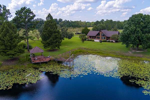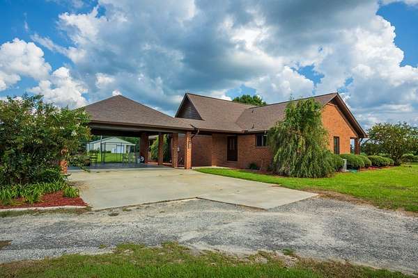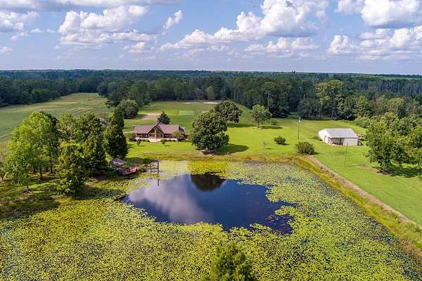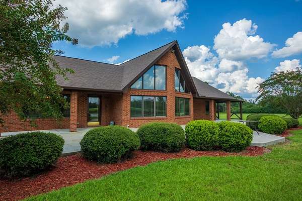 Rare find! Welcome to this beautiful brick home situated on 16.91 peaceful acres, offering the perfect balance of comfortable living and outdoor enjoyment. The property features a 1.5 acre private pond with a dock and a covered gazebo, providing an ideal setting for relaxing evenings, fishing, or entertaining guests. The exterior has been freshly painted and landscaped, and a brand-new roof has been installed, ensuring this home is move-in ready. As you step inside, you are greeted by a large open living room with vaulted wooden panel ceilings that create a warm and inviting atmosphere. Expansive windows overlook the pond and allow natural light to fill the space, while a built-in wet bar makes entertaining easy. The kitchen is spacious and functional, featuring plenty of cabinet space and a breakfast area that is perfect for casual dining. The home offers two generously sized bedrooms. The primary suite includes his-and-hers vanities, two large closets, and a private sunroom. The second bedroom is also oversized with a large closet, providing plenty of storage. A spacious laundry room adds convenience and functionality to the layout. Outdoors, the property includes a large outdoor patio and partially wrap-around covered patio and several other unique features. A large wired workshop with roll-up doors provides ample space for tractors, equipment, or projects. An old sugar kettle storage building adds character and history to the grounds, while mature pecan trees bring shade and a great harvest! There is also a large covered carport that offers additional parking and storage options. This home truly combines comfort, charm, and functionality. Whether you are looking for a place to enjoy peaceful country living, a property with room for hobbies and projects, or simply a home with beautiful views and plenty of space, this property delivers.
