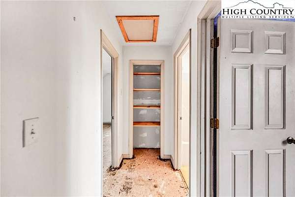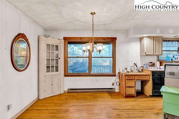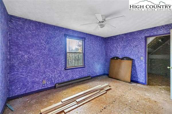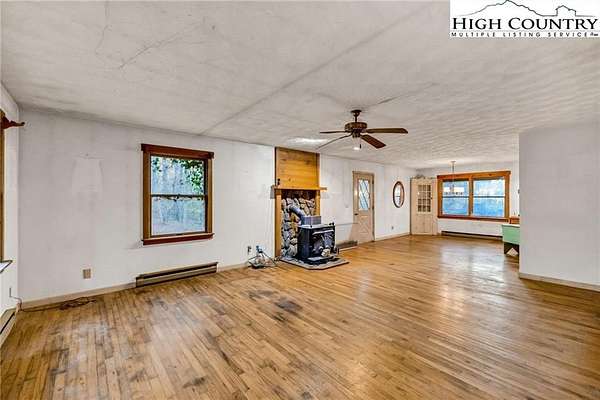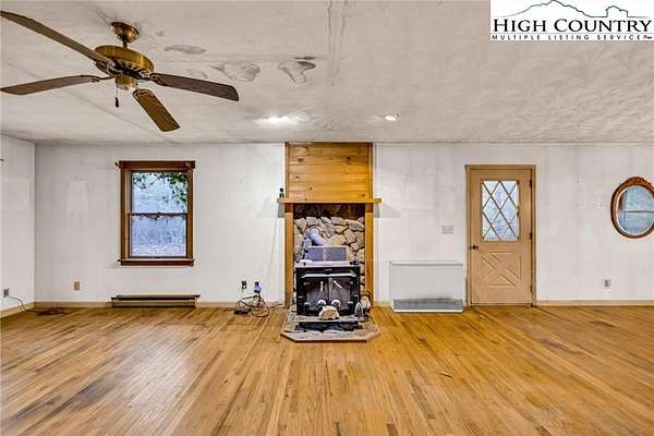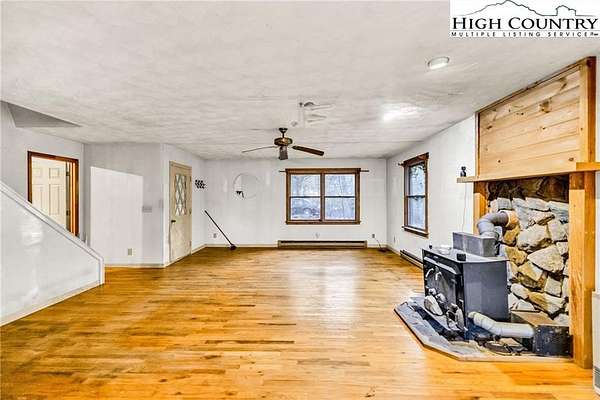 Spacious 4BR/2BA Home on 2+ Wooded Acres in Crumpler and Priced Under $150/SF!! Situated on a peaceful knoll, this home has over 2,000 sq ft home (not including the unfinished basement) offers excellent value and space for a growing family or savvy investor. With some deferred maintenance, this property is being sold "as-is"--a great opportunity for DIY enthusiasts or contractors looking to add value. Nice covered front porch to enjoy,. The main level boasts an open floor plan with beautiful hardwood flooring throughout, a large living room, and a cozy wood-burning fireplace insert. Multiple heating options include baseboard heaters and an ETS unit (which looks similar to a monitor heater) for comfort year-round. The kitchen is open and functional, with generous cabinet space and a full appliance package included. Just off the kitchen, you'll find the primary bedroom, complete with an en suite bath, walk-in shower, and walk-in closet. A separate office or study off the living room adds versatile space for working from home or hobbies.Upstairs, there are three additional bedrooms and a full bathroom. The old carpet has been removed, offering a blank canvas for new flooring.The unfinished basement provides excellent storage and the potential for future expansion. With no neighborhood restrictions, you'll have the freedom to make this property truly your own.