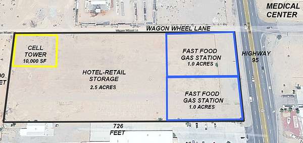 5 acres zoned C-2H Commercial property fronting on Highway 95 in Fort Mohave, Arizona, Property is located at a corner across from the Valley View Medical Center. This level property has 300 feet of frontage and is 726 feet deep. Multiple use options including vehicle sales and service, building materials and lumber, contractor services, and a variety of store uses.