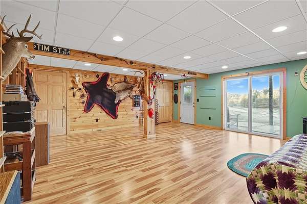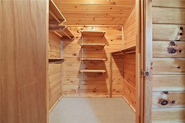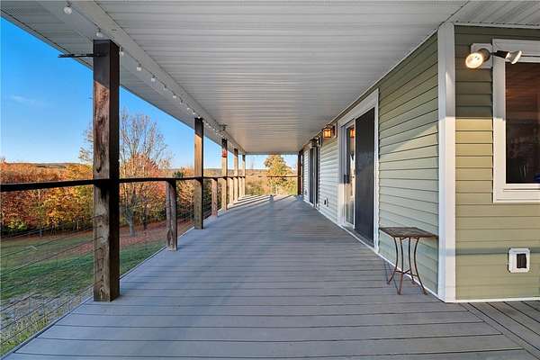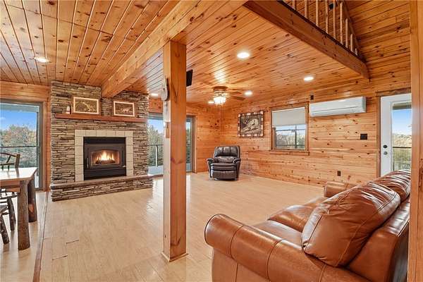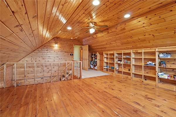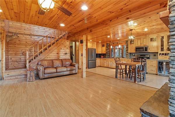 Welcome to a true nature lover's paradise! This two-story home with a walk-out lower level offers almost 3,000 square feet of warm, woodland-inspired living space surrounded by 50 managed acres of QDMA-certified forest with miles of trails and abundant wildlife. The home features 3+ bedrooms, 2 full baths, and a convenient water closet in the lower level. Step inside to find a kitchen that's both functional and artistic - custom-made cabinetry with inlays, unique cabinet pulls, and abundant storage make it the heart of the home. Multiple heating options include efficient heat pumps, a cozy wood stove, and a classic wood-burning fireplace. Enjoy stunning sunsets and panoramic views from the 10-foot-wide deck wrapping around three sides of the home, with a partially screened area perfect for morning coffee or evening gatherings. Outside, your own one-acre blueberry orchard with three organic varieties invites seasonal picking, while a stocked pond of bass and sunfish adds to the tranquil setting. A 3,070 sq. ft. detached barn offers exceptional storage - enough for six cars or all your outdoor equipment. Whether you're an avid outdoorsman, gardener, or someone seeking peace surrounded by nature, this property delivers unmatched beauty, privacy, and comfort.