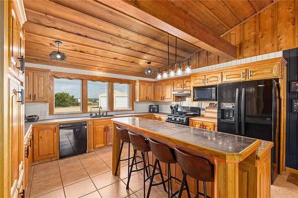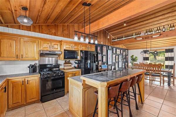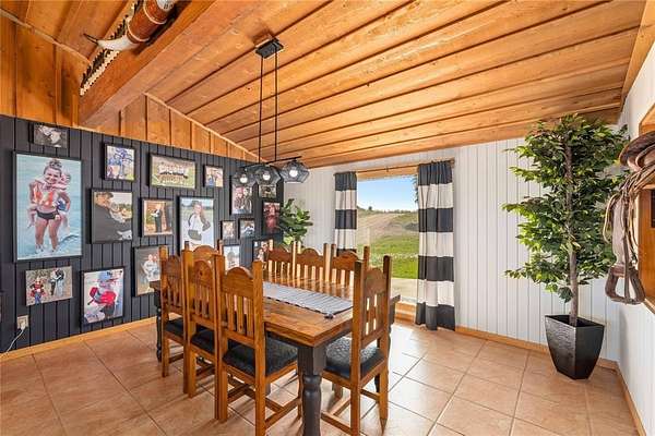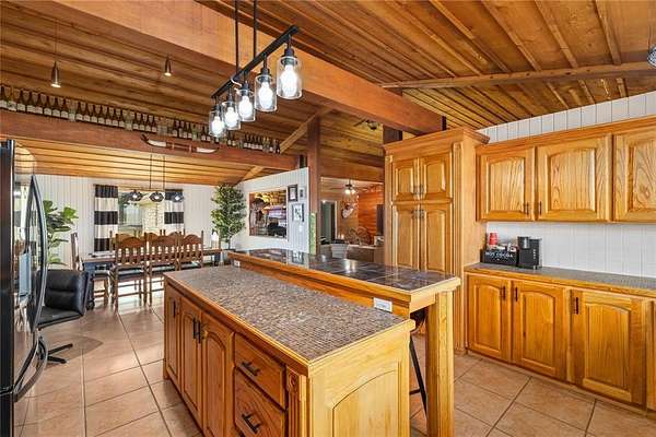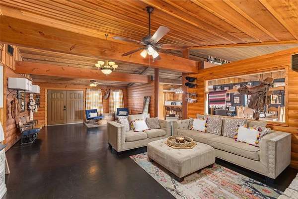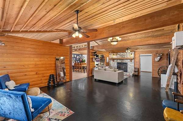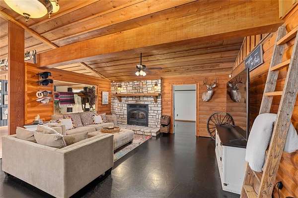 Step inside to a spacious open-concept living, dining, and kitchen area featuring cedar-accented walls, exposed wood beams, and a striking stone fireplace that creates a warm and inviting atmosphere. The layout is ideal for both everyday living and entertaining.