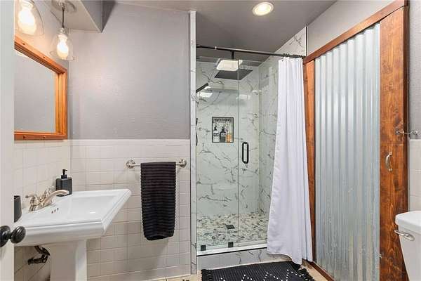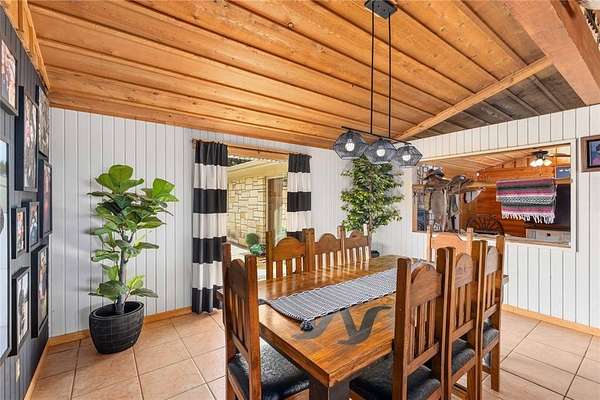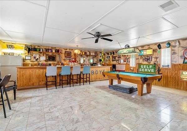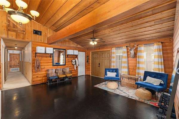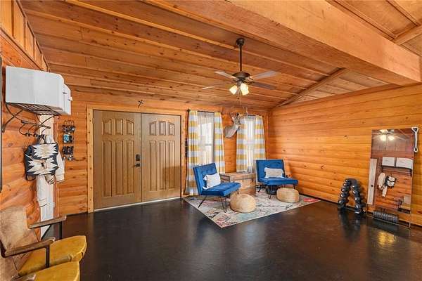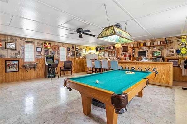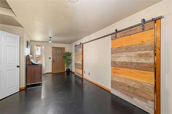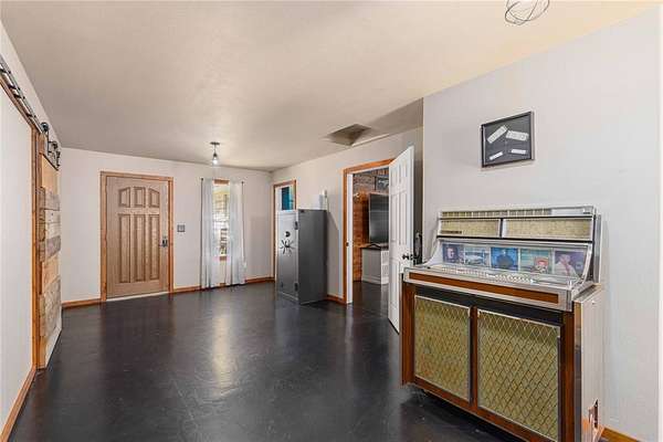 A large game room with a built-in bar provides versatile space for gatherings, recreation, or relaxation. Thoughtful design elements throughout the home include sliding barn doors, decorative doors with metal inserts, and a blend of stained concrete, tile, and carpet flooring.