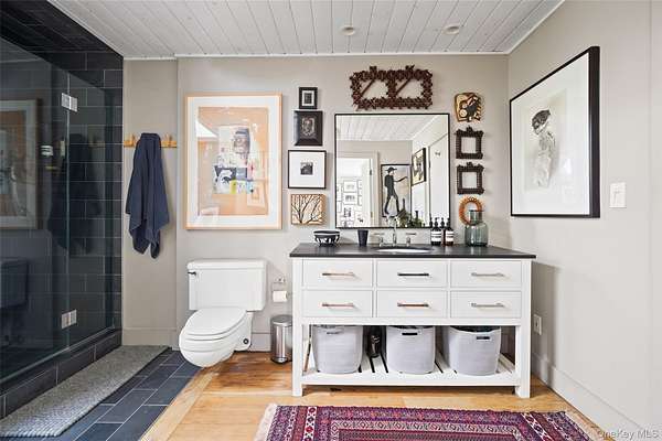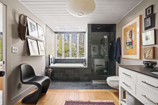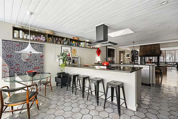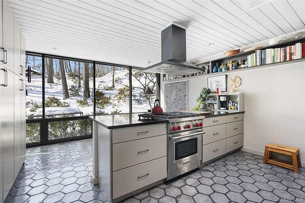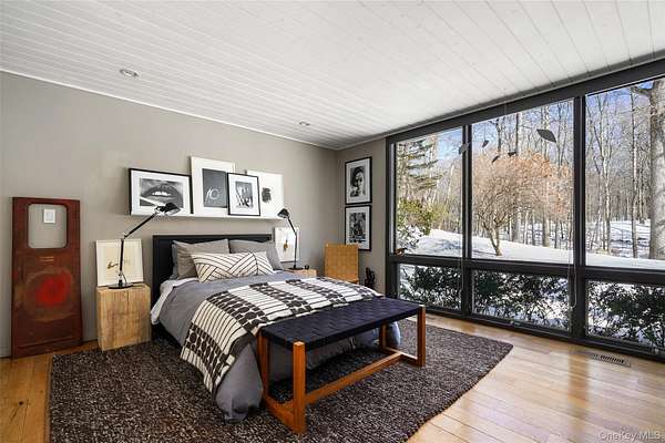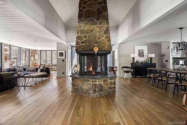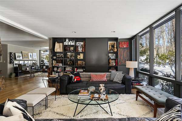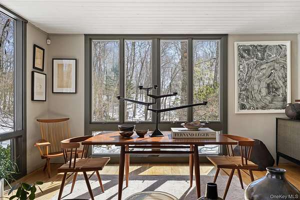 Brookside. The perfect, private refuge. Long drive through woodlands to breathtaking grounds. Exceptional Modern surrounded by flowering trees and perennials, rolling lawns and dramatic rock outcroppings. Open and modern floorplan with a loft-like feel. Sun-filled spaces with high ceilings, walls of glass and skylights. Clean, modern aesthetic perfect for showcasing art and furnishings. Dramatic Foyer with floor-to-ceiling fireplace. Open Living Room and Dining Area. Chef's Kitchen with custom cabinets, honed granite counters, two working islands and a breakfast area. Comfortable Den with skylight and window wall. Private Primary Suite with skylit Bath. Second Bedroom with ensuite Bath. Beautifully finished lower level with Family Room/Artist Studio/potential Bedroom. Private Swimming Pool overlooking a babbling brook. Peaceful setting yet easy drive to Scotts Corners, New Canaan, Metro-North trains and the Merritt Parkway. An incredible offering!