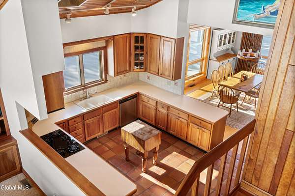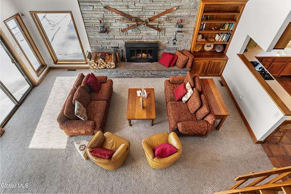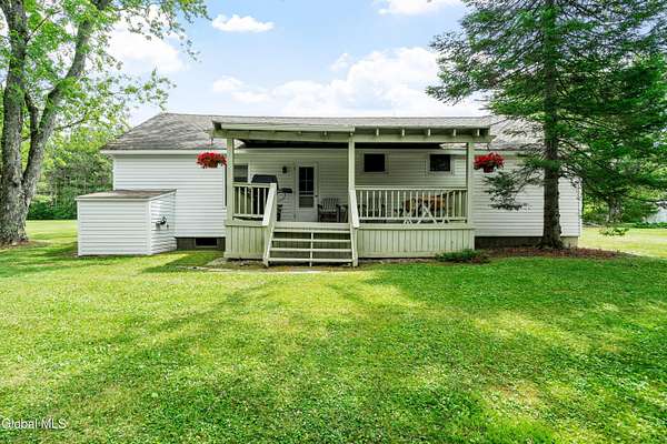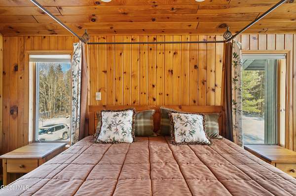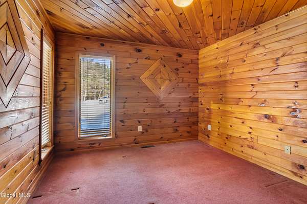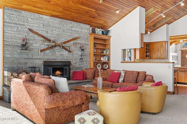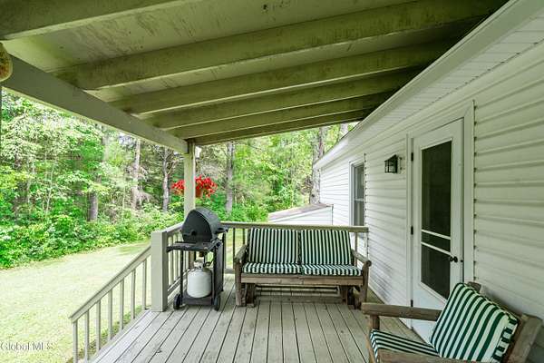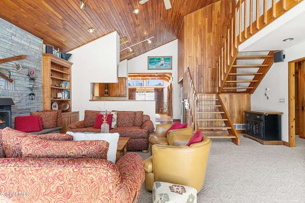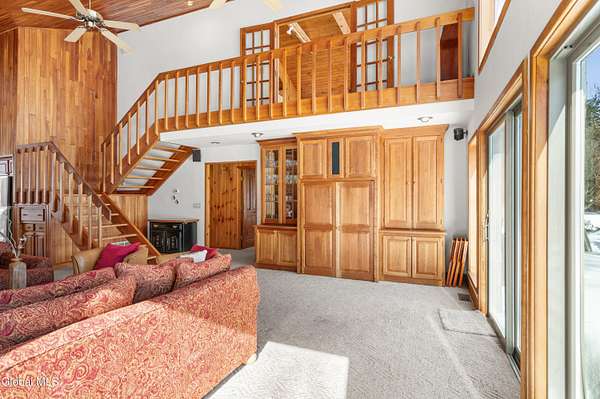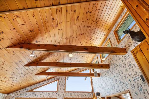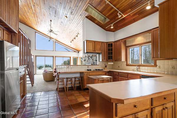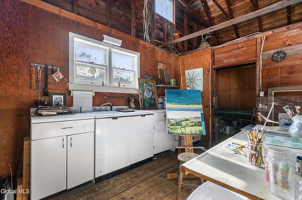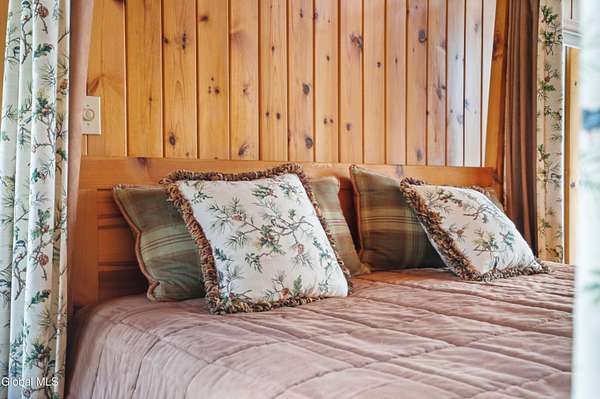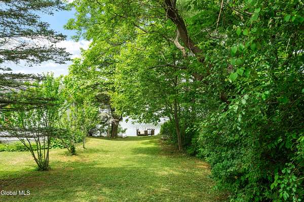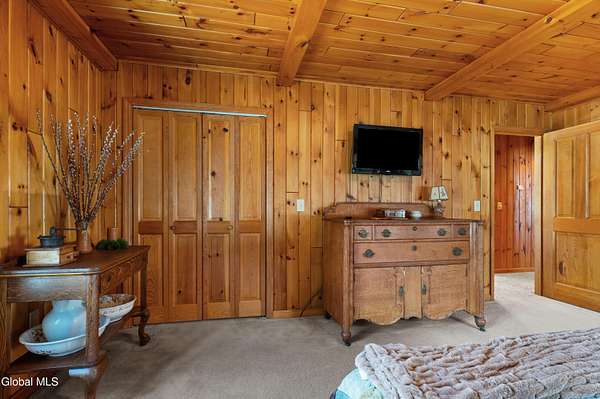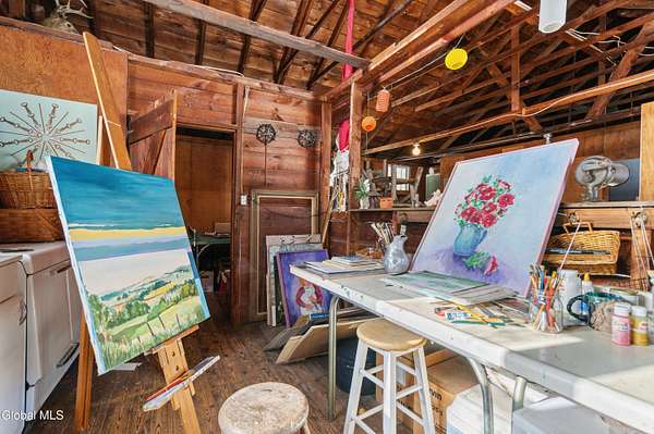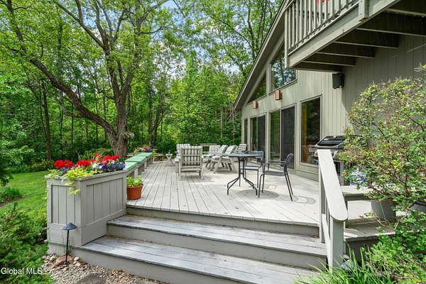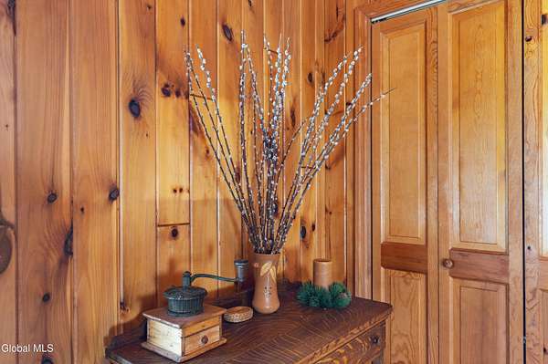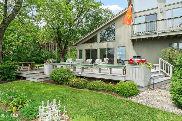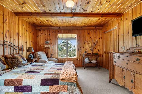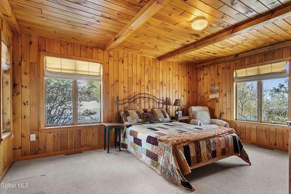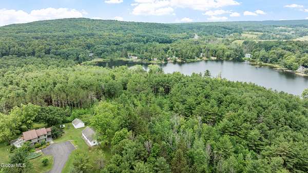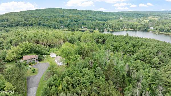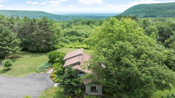Welcome to a truly rare and inspiring retreat in the award-winning Voorheesville School District. Located in the hamlet of East Berne, this haven is nestled among a breathtaking 8.96-acres of multiple parcels with sweeping vistas of the Helderberg Mountains and the Albany skyline, offering exceptional privacy, versatility, and a true sense of escape. The main residence features a warm Adirondack-style interior highlighted by extensive cherry wood throughout, while the contemporary exterior blends seamlessly into the natural landscape. The home offers 3 bedrooms, 2 baths, and 2,601 sq ft of inviting living space. An expansive great room showcases a dramatic wall of windows and sliders that frame the stunning scenery, complemented by an original stone fireplace, cathedral ceilings, and exposed beams. The second-floor primary suite spans the length of the home and includes a sitting area, spa-like bath with soaking tub and walk-in shower, and a private deck overlooking the mountain and city backdrop. A spacious two-tier rear deck provides an ideal setting for entertaining or quiet relaxation. Steeped in local history, the barn was originally built to host clam bakes & weddings and now serves as a recreation/studio with an attached seasonal cottage offering approximately 746 sq ft, including 2 bedrooms and 1.5 baths--perfect for rental income, guests, extended family, or a creative retreat. The barn also offers potential for conversion to additional living or studio space. The included 7.13-acre parcel on Wolf Hill Road preserves the iconic Helderberg escarpment views and enhances privacy along with an adjacent 1 acre lot. Enjoy water access and own dock on Helderberg Lake via deeded easement. Close proximity to Thacher Park, nearby lakes, Albany, and NYC. With low taxes, remarkable surroundings, and unmatched flexibility, this property is ideal as a multi-generational retreat, family compound, or serene getaway. Don't miss this extraordinary opportunity.