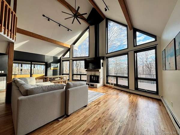 Welcome to this breathtaking A-frame home featured on HGTV's "Small Town Potential." Spanning 3,000 square feet, it boasts a 24-foot ceiling and floor-to-ceiling windows in the great room, creating an impressive sense of space and light. The home includes three spacious bedrooms and three full bathrooms, including a remodeled master bath. The open-concept design features a large updated kitchen with stainless steel appliances, granite countertops, and an oversized island. A new air conditioner (2022) and a whole-house Generac generator ensure comfort and reliability. Step outside to an expansive Trex deck with cable railings, a newly paved driveway, an oversized two-car garage, and a screened-in porch. The fully fenced backyard is perfect for pets and outdoor activities. This home sits on 6 acres, providing ample space and privacy. The fully finished basement includes a bonus room and full bathroom, ideal for a play area or home gym.