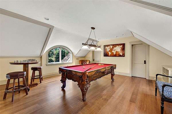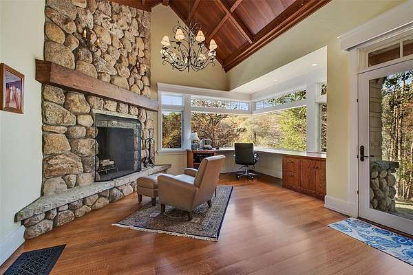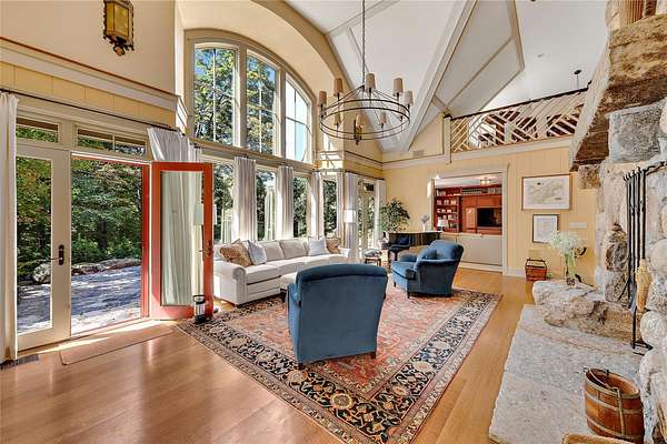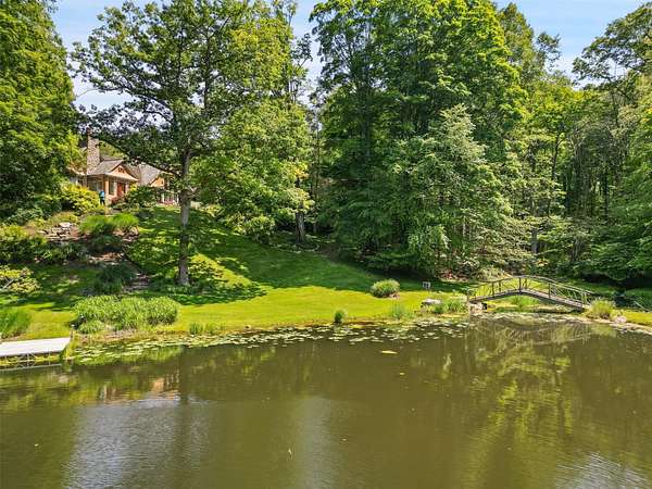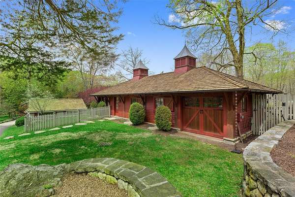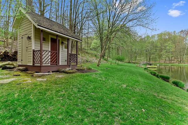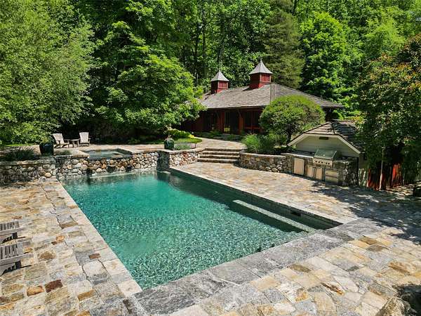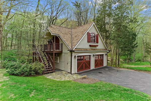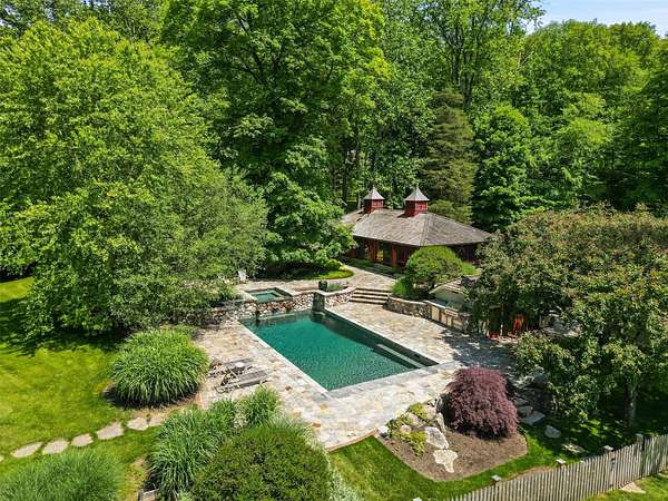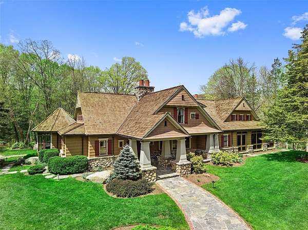 Two Ponds. Long, gated drive to perfect privacy. Spectacular Arts & Crafts Style Estate. Handsome Stone and Shingle facade with peaked roof and massive pillars. Designed by local architect Ralph Mackin and built by Danny Devito in 2002. Approximately 5000 square feet of living space. Stunning interior spaces with fabulous detailing, floor-to-ceiling stone fireplaces, raised paneling and incredible millwork. Perfectly scaled rooms for entertaining yet completely comfortable for everyday living. Entrance Hall with stone fireplace and beamed ceiling. Phenomenal Great Room with vaulted ceiling, impressive floor-to-ceiling stone fireplace and two sets of French doors to the rear terrace. Chef's Kitchen open to the octagonal Dining Room with vaulted ceiling and beadboard detailing. Paneled Media Room. First Floor Primary Suite with Sitting Room and luxurious Spa Bath. Spacious Loft with Reading Room and large Bedroom Suite with Bath. Stone terrace with firepit overlooking two scenic ponds. Two Guest Houses. Pool with spa, outdoor kitchen, outdoor shower and Pool House. Nearly eight acres adjoining the protected lands of the 4315-acre Pound Ridge Reservation. The perfect family compound or peaceful retreat.