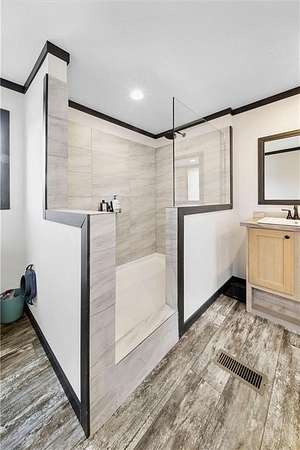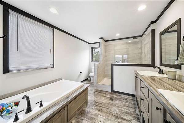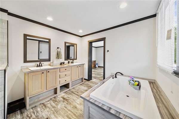 - Beamed Ceilings, Crown Molding, Double Vanity, Recessed Lighting, Walk In Closets