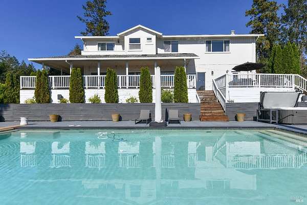 Step into 540 Edgemont Lane, where the essence of Wine Country living unfolds. This stunning residence boasts 4 bedrooms, 3.5 baths, a chic kitchen, and an inviting great room adorned with contemporary light fixtures, a fireplace, and an additional room adjacent to the kitchen. The wrap-around porch complements the timeless allure of this Farmhouse-style dwelling. Entertaining is a delight on the expansive deck overlooking a serene pool and capturing boundless vistas of Napa Valley and its famed vineyards. Nestled in the lower reaches of Angwin and a mere 10-minute drive from downtown St. Helena, this property offers a coveted location. Set on approximately 1.87 acres, it features a private gated entrance, providing both seclusion and accessibility. This space is an idyllic retreat for family and friends, offering an ideal haven to call home. The pool area further enhances its charm, making it a splendid locale for entertaining loved ones, raising a family, or creating a perfect remote working environment.