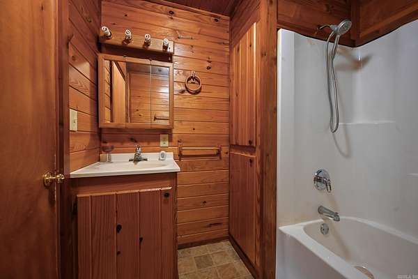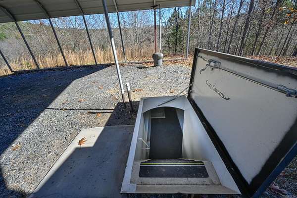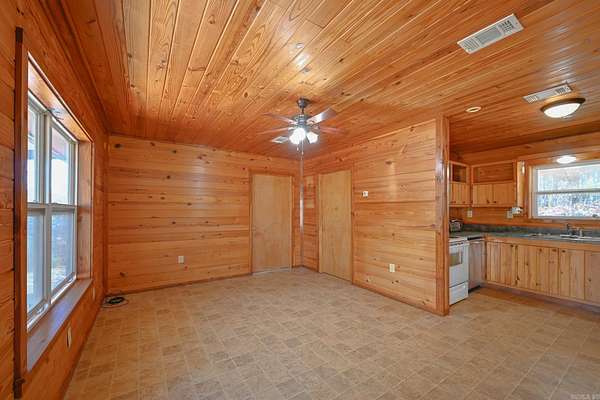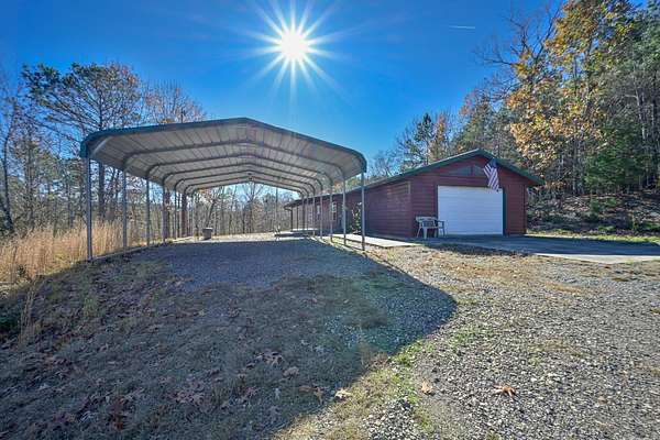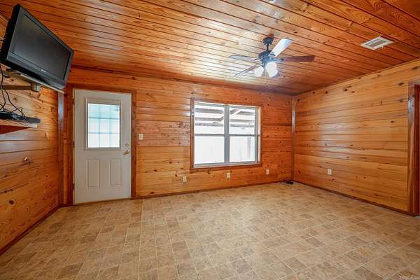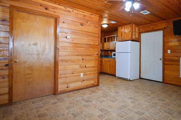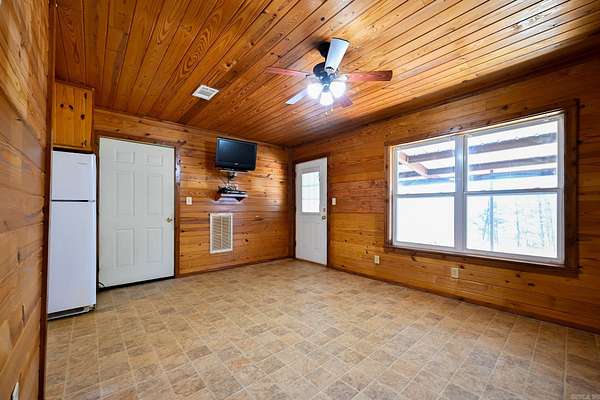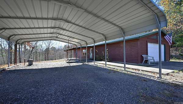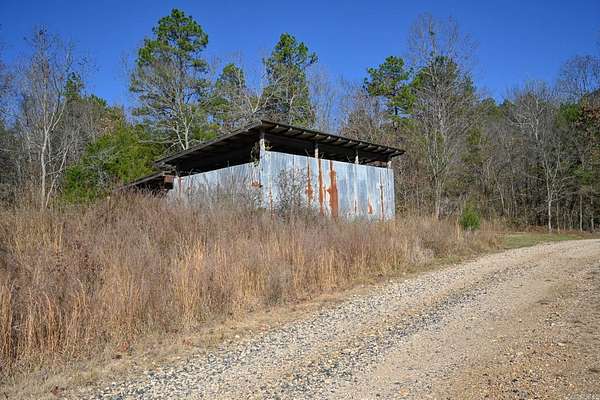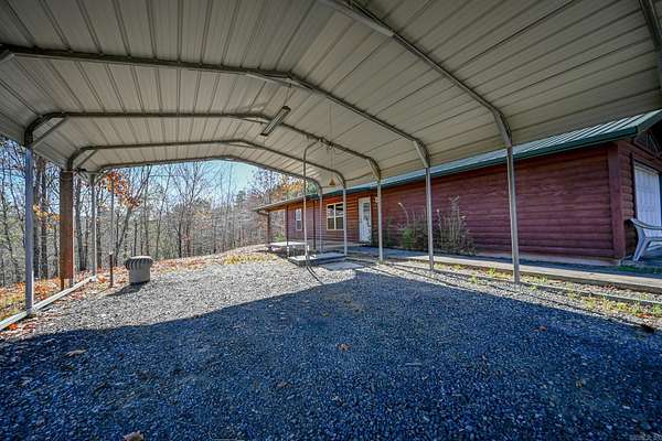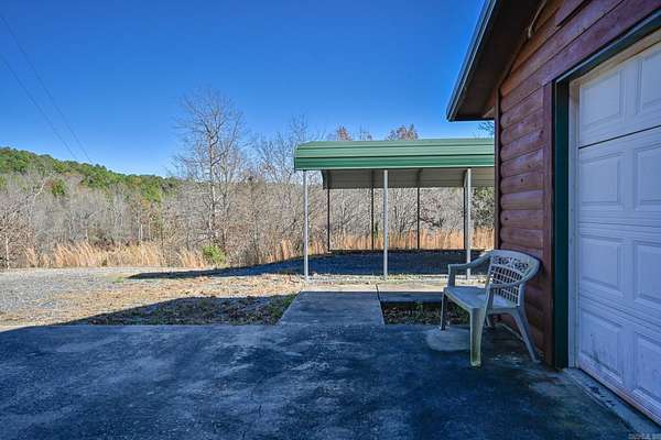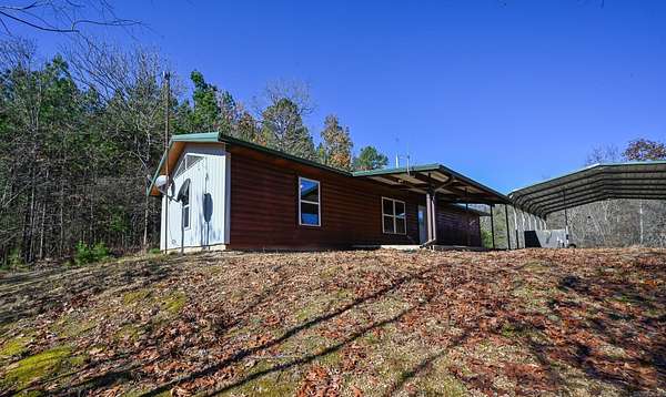 Discover the perfect blend of space and outdoor recreation with this cabin on 4+/- wooded acres near the Ouachita National Forest and convenient ATV riding areas. Inside features include a large bedroom with a walk-in closet, full-size washer and dryer, wood accents, log-style siding, and a spacious full bathroom. The property also includes a two-car garage, a like-new metal carport, and an in-ground storm shelter under the carport equipped with a bed and microwave. The land is gently elevated with trees creating a natural wooded backdrop, along with a small fenced pasture area suitable for livestock or a starter homestead, and a poured slab ideal for creating an outdoor hangout space. Nearby creeks offer additional outdoor enjoyment, making this property suitable for either full-time living or a weekend getaway close to recreation.