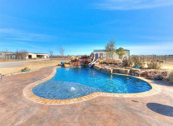 Opening to the outdoors, the backyard is a showpiece in itself--featuring a beautiful in-ground pool with a grotto, slide, and fire pit, the perfect setting to gather with friends or simply relax under the night sky.
