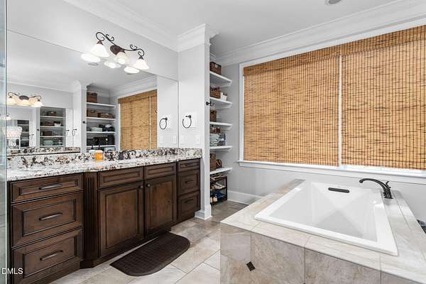- Bathtub/Shower Combination, Bookcases, Built-In Features, Ceiling Fan(s), Central Vacuum, Chandelier, Coffered Ceiling(s), Crown Molding, Double Vanity, Dual Closets, Eat-In Kitchen, Entrance Foyer, Granite Counters, High Ceilings, High Speed Internet, Kitchen Island, Kitchen/Dining Room Combination, Living/Dining Room Combination, Open Floorplan, Pantry, Primary Downstairs, Recessed Lighting, Room Over Garage, Second Primary Bedroom, Separate Shower, Smooth Ceilings, Soaking Tub, Tray Ceiling(s), Vaulted Ceiling(s), Walk-In Closet(s), Walk-In Shower