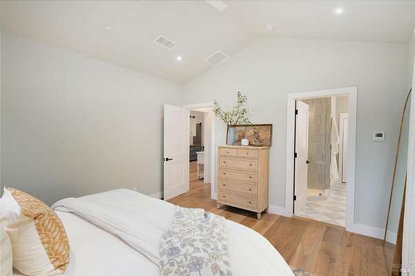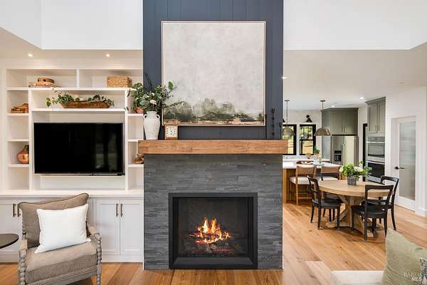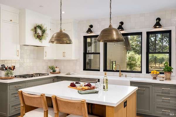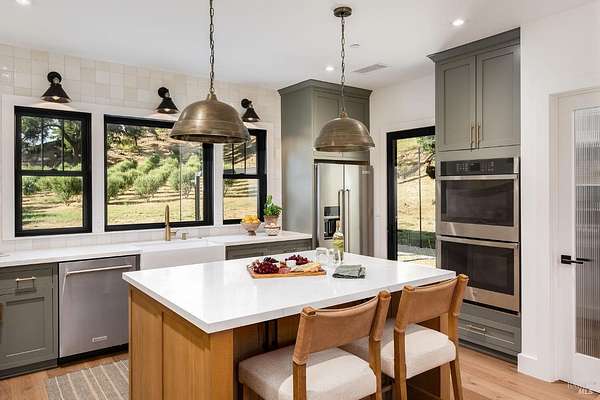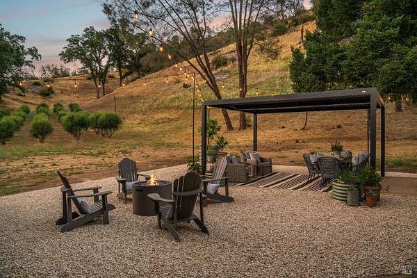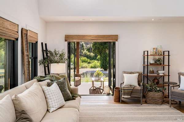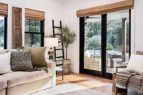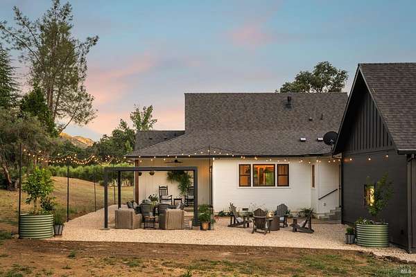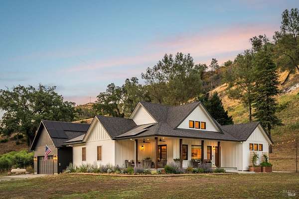 5400 Wragg Canyon epitomizes the allure of the Napa Valley fused with the tranquility of a private ranch. Crafted in 2023 with the discerning owner in mind, the 3 bedroom, 2 bath single story 1,925 sq ft modern farmhouse provides a sophisticated yet relaxed haven with a spacious open floorplan. The 16 ft vaulted great room, bathed in natural light through the extensive use of Marvin windows and doors, is complimented by clean lines, custom cabinetry, a warm color palette, French oak wood floors, quartz and spa influenced surfaces. True to the farmhouse aesthetic, the covered porches provide quiet sanctuaries to unwind and allow for a seamless indoor-outdoor flow. With full Wildland-Urban Interface compliance, the build highlights state of the art materials and construction with the use of Boral/Hardie Back siding, Vulcan air vents, water hydrant, storage tanks, Nuvo UV filtration, owned Solar and advanced fire suppression. Sited on approx.15 acres, minutes to the Pleasure Cove Marina, the creek side setting meanders through an expansive olive grove, producing upwards of 50 gallons annually of artisan oil, winding past the 4 stall pole barn and corrals. A detached garage completes this unparalleled retreat, offering privacy, luxury, and endless possibilities in Wine Country.