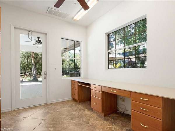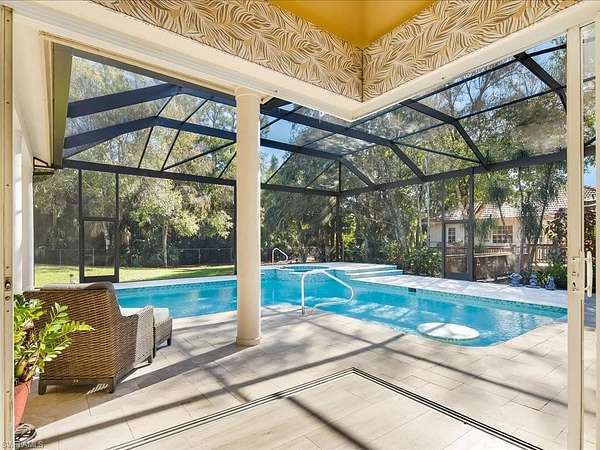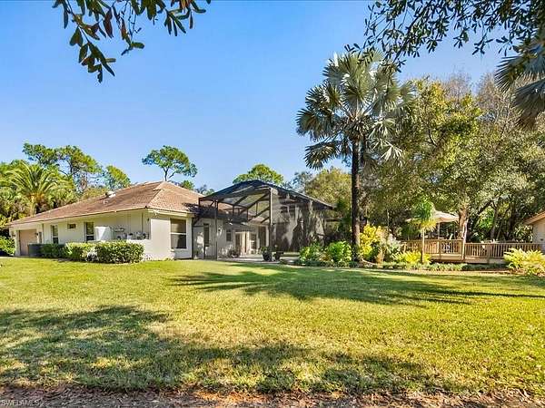 Privately set on an exceptionally rare and beautifully proportioned acreage, 5410 Mahogany Ridge Drive presents a compelling blend of space, craftsmanship, and effortless Naples living within the coveted Logan Woods community, where estate-style homes enjoy freedom from HOA fees and a sense of quiet seclusion. This solidly built DIVCO residence rests on approximately two point five seven acres of lushly landscaped grounds, offering a square, highly usable homesite with a fenced side yard and total privacy. Designed with entertaining and flexibility in mind, the home's recently renovated southern-exposure pool and spa enjoy sun throughout the day, enhanced by an upgraded picture-screen enclosure and a dedicated pool bath. Zero-corner sliding glass doors dissolve the boundary between indoors and out, creating a seamless flow to an expansive open-air deck ideal for large gatherings, alfresco dining, or tranquil evenings beneath the stars. Inside, nearly two thousand nine hundred fifty-three square feet of thoughtfully designed living space unfolds in a four-bedroom, three-bath split floor plan. New tile flooring, plantation shutters, and custom cabinetry elevate the interiors, while the gourmet kitchen anchors the home with an induction cooktop, double convection wall ovens, generous prep space, and an inviting layout tailored for both everyday living and hosting. A distinctive highlight is the five hundred seventy-six square foot air-conditioned outbuilding, complete with a full bath and space for refrigeration, offering exceptional versatility as a guest suite, private office, workshop, or potential income-producing efficiency. Additional features include a whole-house water filtration system, mature fruit trees, a circular driveway with dual access points, and ample room for boat or recreational vehicle parking. Ideally positioned just minutes from the beaches, dining, and shopping that define the Naples lifestyle, this is a rare opportunity to enjoy privacy, flexibility, and refined outdoor living on one of Logan Woods' most desirable homesites.