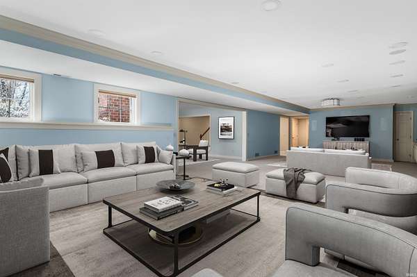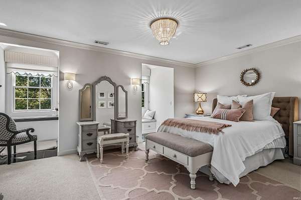 Experience luxury living on an extraordinary scale in this beautifully updated 6 BR, 7 BA, 7,500+ sq. ft. estate on 11.66 acres in the sought-after Brigadoon community of Southwest Allen County. The grounds alone feel like a private resort, complete with a pond, cement heated pool, koi pond, pool house, outdoor wood-burning brick fireplace, impressive hardscape, and multiple decks overlooking lush landscaping, fruit trees, and an enchanting organic English garden with wrought-iron fencing, a fountain, a pergola, and thoughtfully designed cutting beds. Inside, a grand two-story foyer opens to warm, inviting living spaces including a bright living room with a gas fireplace, an elegant dining room with built-ins and its own fireplace, and a main-floor office with custom cabinetry. The new chef's kitchen feels magazine worthy with commercial-grade appliances, multiple quartz islands, an expansive hearth room with a fireplace, a butler's entertaining island, updated lighting, and sliders leading to one of several outdoor terraces. A redesigned mudroom and laundry wing adds everyday convenience with built-ins and additional appliances, and a large multi-purpose room with deck access currently serves as a fitness space. The new main-floor primary suite is a true retreat with marble finishes, double vanities, a walk-in shower, soaking tub, custom benches, beautiful lighting, and a California Closets wardrobe. Upstairs are five bedrooms and three baths, including a second primary en suite with marble accents, an additional bedroom en suite, and two bedrooms connected by an updated Jack and Jill bath. The fifth bedroom is currently a craft room but easily functions as a bedroom, playroom, or flexible space. The daylight lower level offers a cozy fireplace, a recreation zone, a full bath, and generous storage. This is a rare combination of character, comfort, and breathtaking surroundings designed for memorable entertaining and peaceful everyday living.