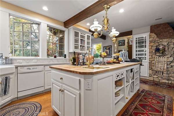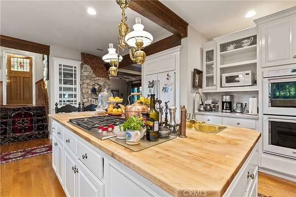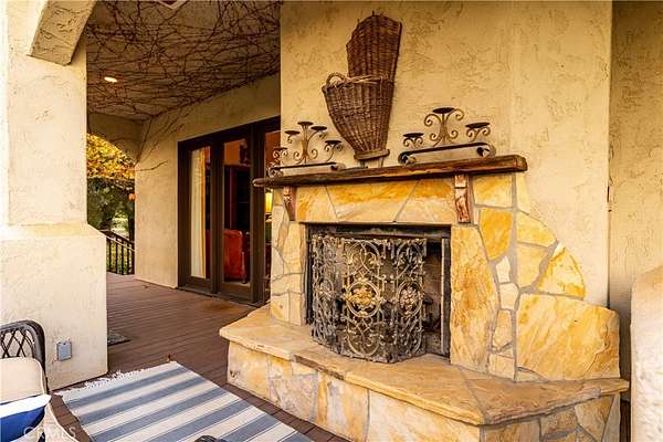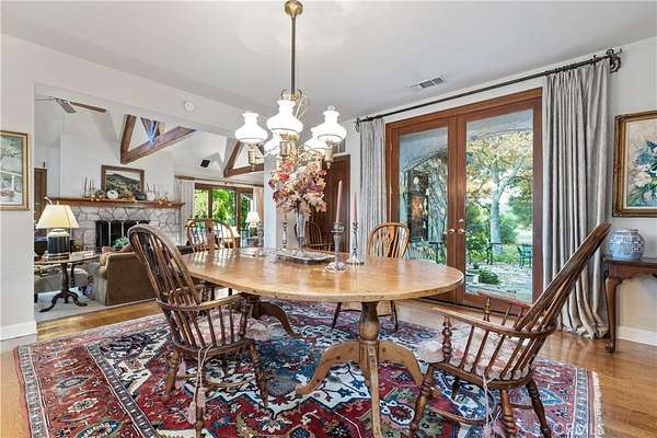 The kitchen is a gathering place, featuring a cozy breakfast nook with a Dutch door opening to the sunlit backyard and multiple seating areas. A formal dining room invites evenings of conversation, while the family room with a spectacular indoor/outdoor stone fireplace and multiple double doors spills onto a wraparound porch overlooking vineyards, oak groves, and rolling hills.
