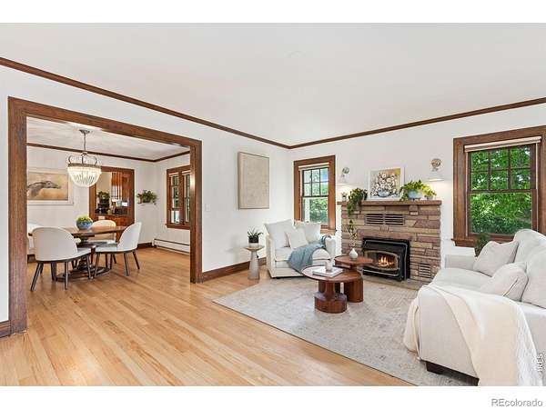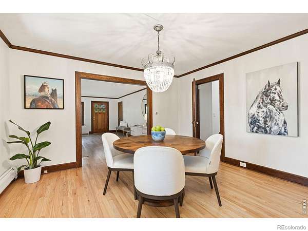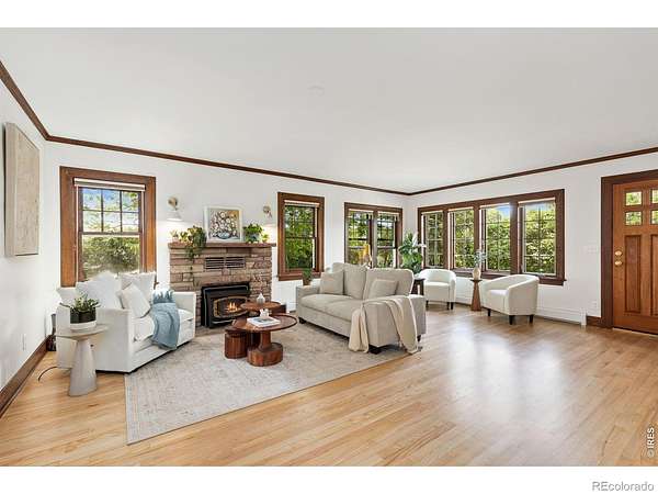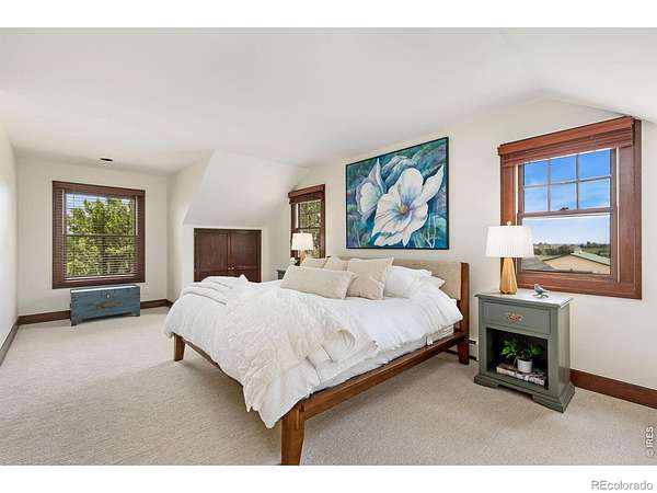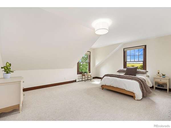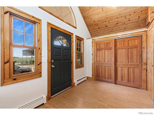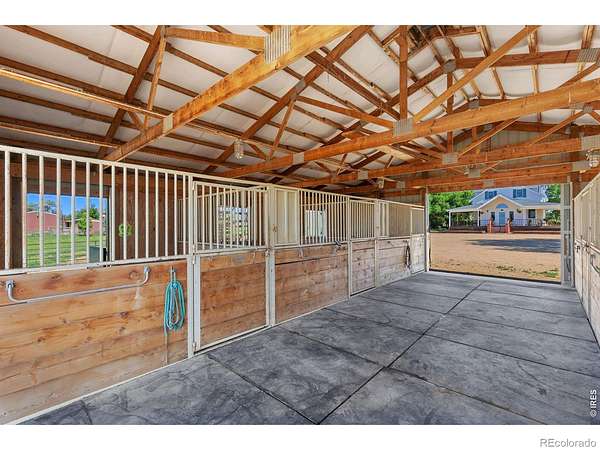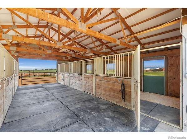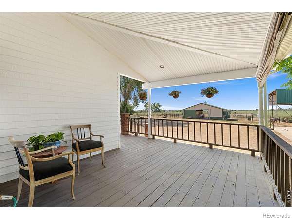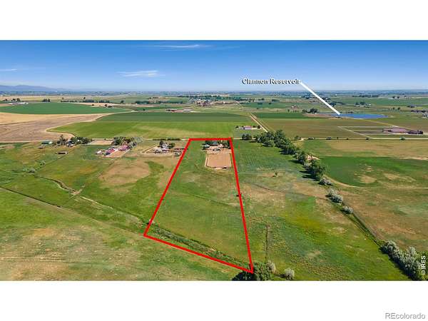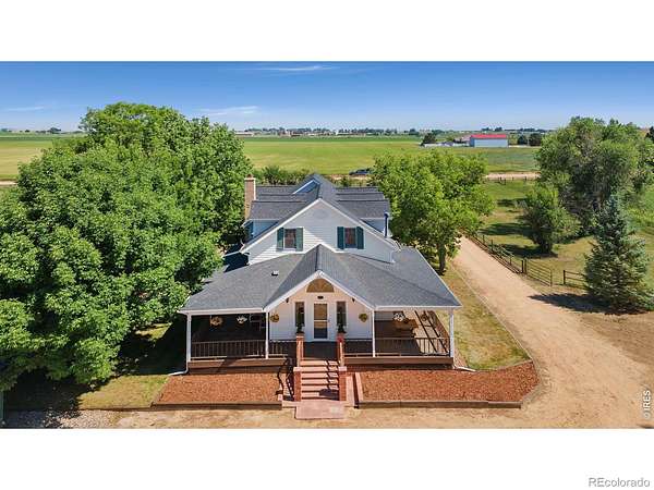 Set on 11+ acres with sweeping mountain views, this 1934 Craftsman-style 5BD/3BA farmhouse offers equestrian amenities, hay production, and modern upgrades. Features include a 6-stall barn, large outdoor arena with premium footing, custom hay shed designed for stack retriever delivery, finished basement, and wraparound porch. Eligible for Mead schools and with easy access to Denver, Boulder, and Fort Collins, this property blends historic charm with country functionality. Originally built in Denver's Highlands in the 1930s, the home was relocated to its current setting, where the lower level was finished and the upper level added in 2000. The home includes a formal dining room, study, breakfast nook, multiple porches, and a lilac privacy wall. A gravel driveway leads to a central courtyard surrounded by the home's mudroom entry, barn, 3-bay shop with attached tack room and equipment storage, hay storage, and lawns. The barn's left-side stalls feature outdoor runs that open to a dry lot turnout, while the right side opens to another dry lot. The large roping arena includes a cattle chute and jump-friendly footing. Hay-producing smooth brome pastures total 8+ acres and yield 200-300 bales/year. Hay storage holds over 1,500 bales. Pastures are fully fenced and include a large pasture that extends from County Road 36 to a one-acre rear pasture, and a 1/4 acre paddock on the left side of the driveway. Recent 2025 upgrades include refinished wood floors, new carpet, remodeled upstairs bathroom, radon mitigation system, new interior/exterior paint, and added fencing. Close to shopping, nurseries, restaurants, and the new Bella Ridge Golf Club.
