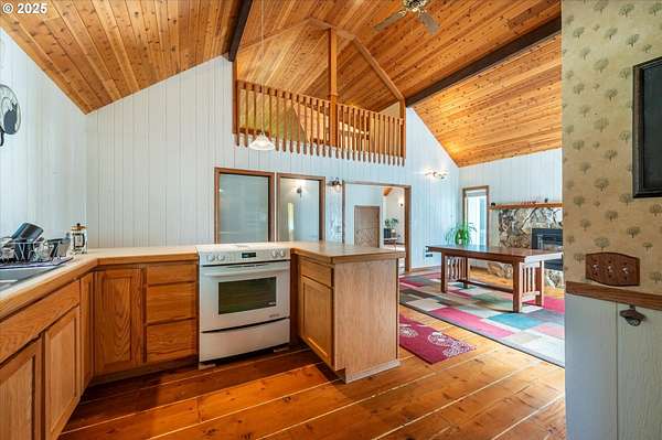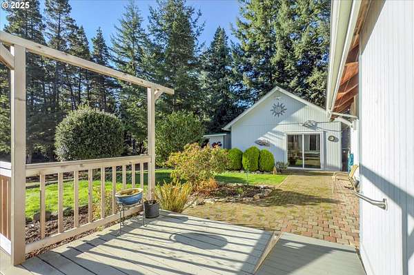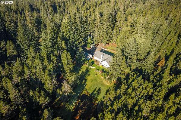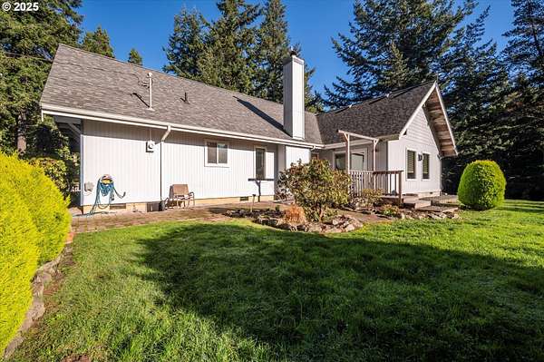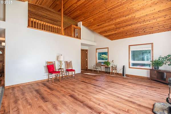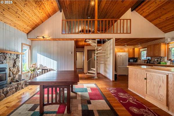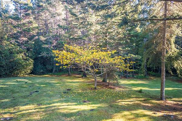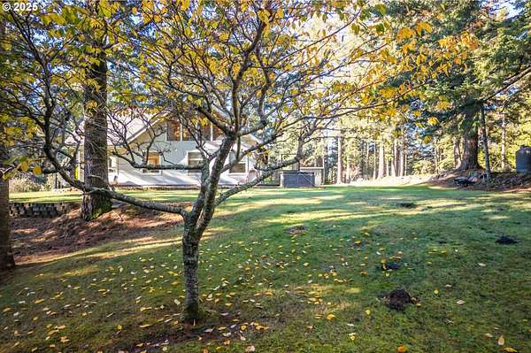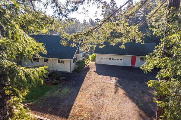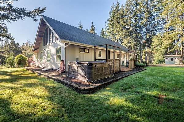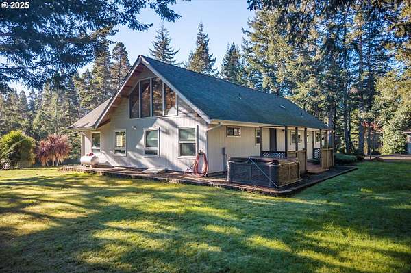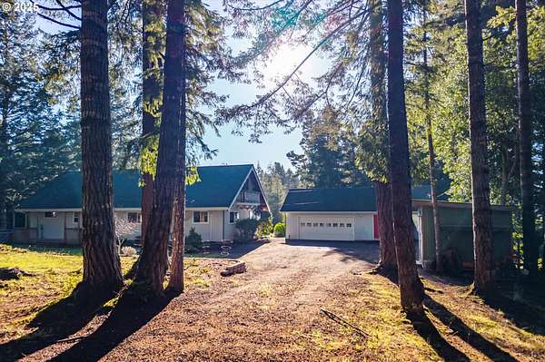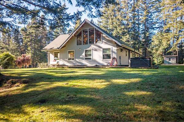 Nestled in a peaceful country setting on 5.14 acres, this welcoming 1974 home offers 2,593 square feet of comfortable living and timeless rustic charm. Thoughtful updates, warm wood finishes, and expansive spaces inside and out to relax, entertain, and enjoy. The main level features a split floor plan with a primary en suite on one side and a second bedroom and bath on the other, offering privacy for guests and family. The spacious living room showcases vaulted wood ceilings, a propane fireplace, and an open loft above that's perfect for a reading nook, hobby area, or cozy media space.The country kitchen offers all appliances, a casual dining area with pellet stove, and a charming spiral staircase that leads to a second loft, ideal for office, studio, or play space. A generous laundry / utility room provides extra storage and everyday convenience. Outside, enjoy a sunny porch, deck with hot tub, and an additional outbuilding for extra storage or gear, all surrounded by trees and open lawn for gardening, pets, or simply soaking in the natural setting. A detached two car garage includes a bonus finished area with bath, creating excellent potential for a studio, guest retreat, or flexible workspace, while a separate tool shed or creative space sits just behind the garage. The property offers the feel of a private retreat yet keeps you within an easy drive of Bandon's beaches, Old Town, and everyday services. Welcome to the stunning Pacific coastline, world class golf, fishing and crabbing, a mild climate, and a small town community known for its local shops, galleries, and restaurants.