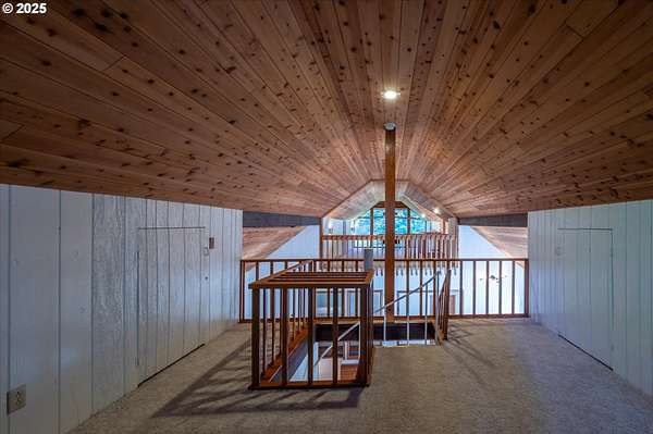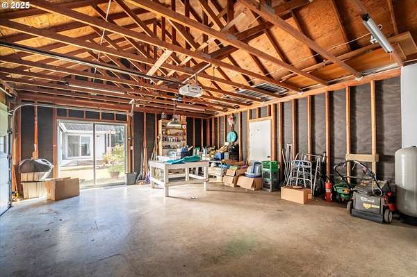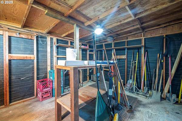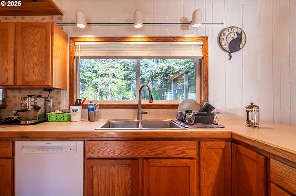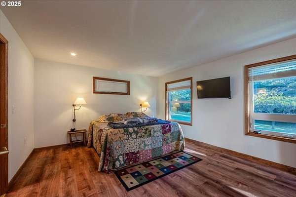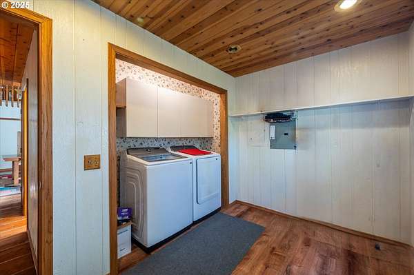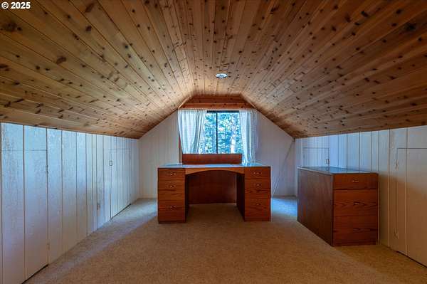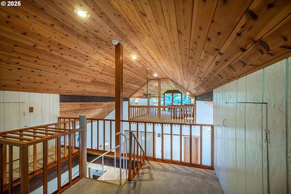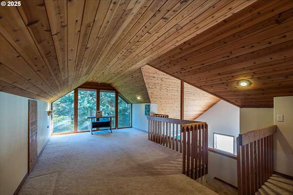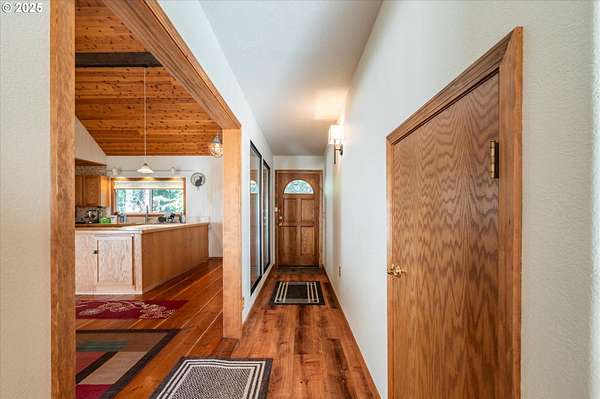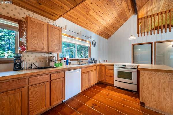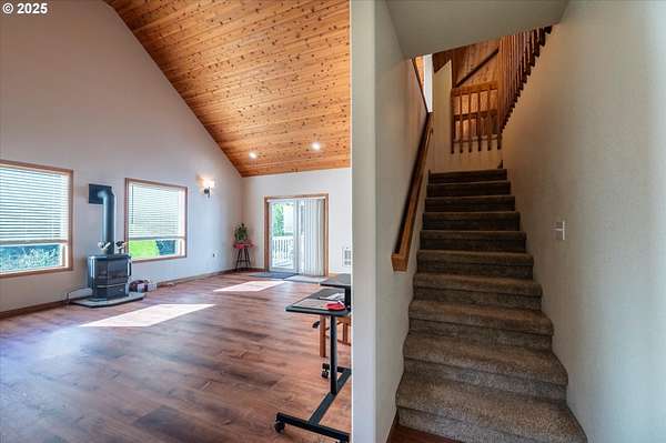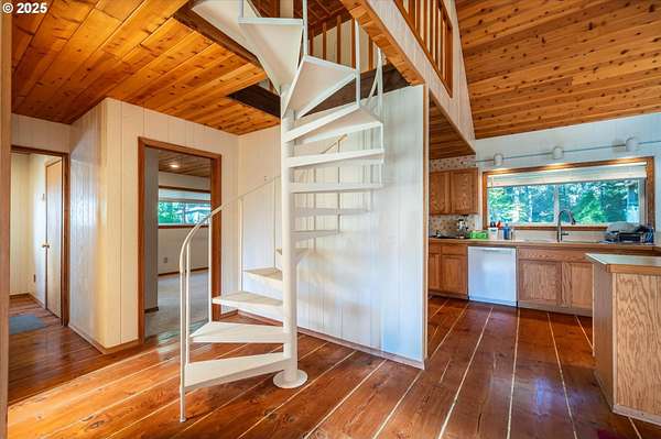 Nestled in a peaceful country setting on 5.14 acres, this welcoming 1974 home offers 2,593 square feet of comfortable living and timeless rustic charm. Thoughtful updates, warm wood finishes, and expansive spaces inside and out to relax, entertain, and enjoy. The main level features a split floor plan with a primary en suite on one side and a second bedroom and bath on the other, offering privacy for guests and family. The spacious living room showcases vaulted wood ceilings, a propane fireplace, and an open loft above that's perfect for a reading nook, hobby area, or cozy media space.The country kitchen offers all appliances, a casual dining area with pellet stove, and a charming spiral staircase that leads to a second loft, ideal for office, studio, or play space. A generous laundry / utility room provides extra storage and everyday convenience. Outside, enjoy a sunny porch, deck with hot tub, and an additional outbuilding for extra storage or gear, all surrounded by trees and open lawn for gardening, pets, or simply soaking in the natural setting. A detached two car garage includes a bonus finished area with bath, creating excellent potential for a studio, guest retreat, or flexible workspace, while a separate tool shed or creative space sits just behind the garage. The property offers the feel of a private retreat yet keeps you within an easy drive of Bandon's beaches, Old Town, and everyday services. Welcome to the stunning Pacific coastline, world class golf, fishing and crabbing, a mild climate, and a small town community known for its local shops, galleries, and restaurants.