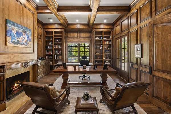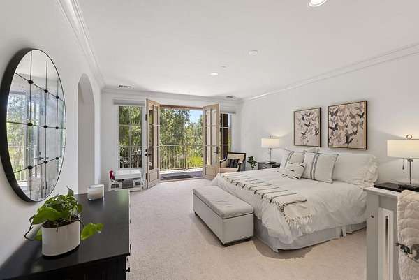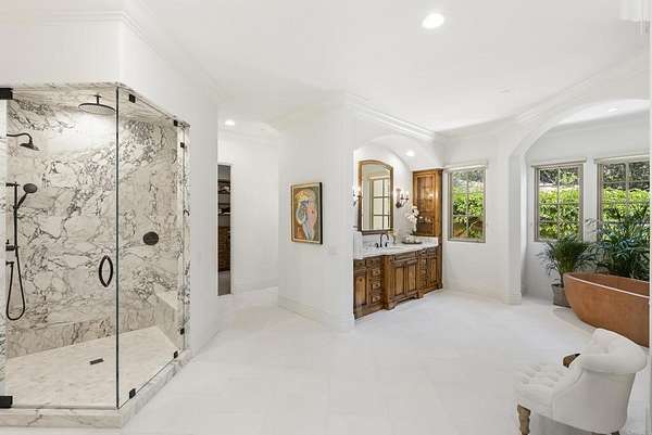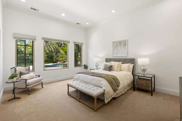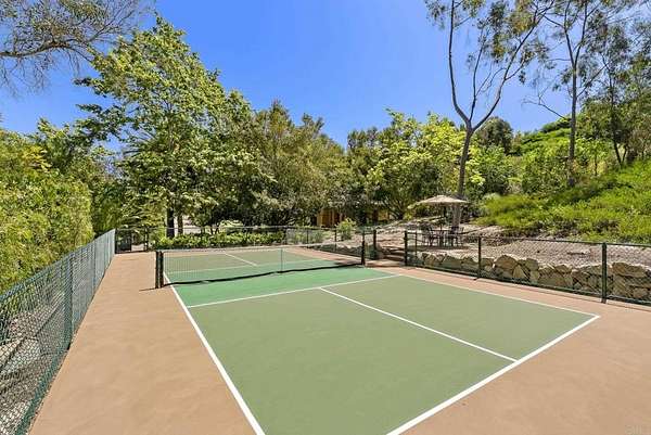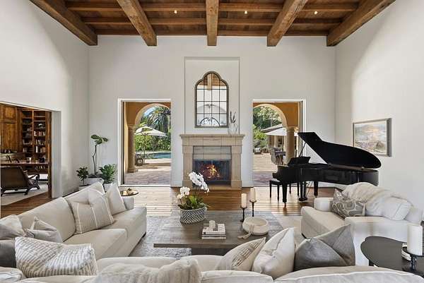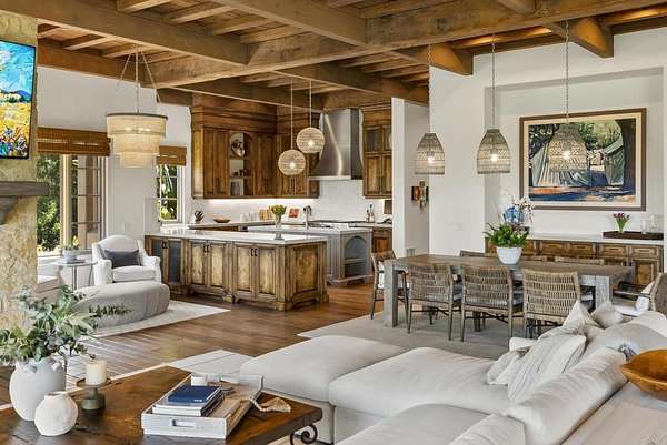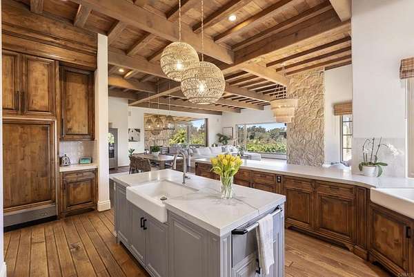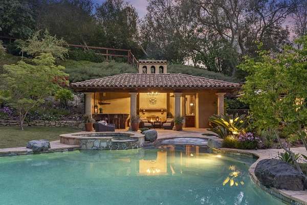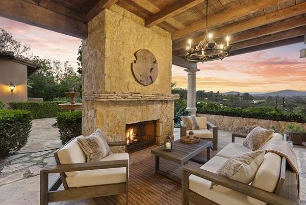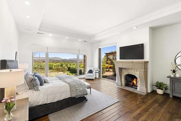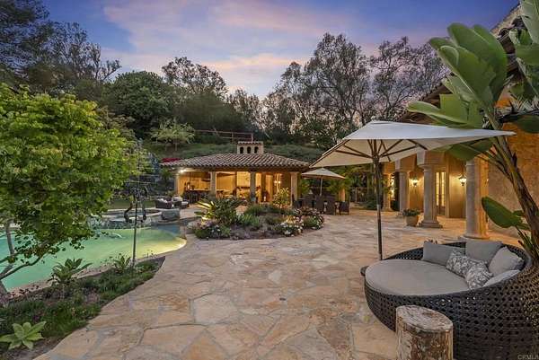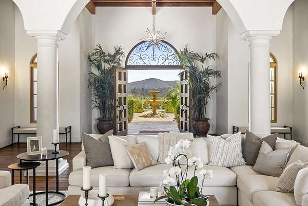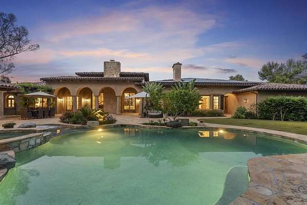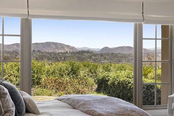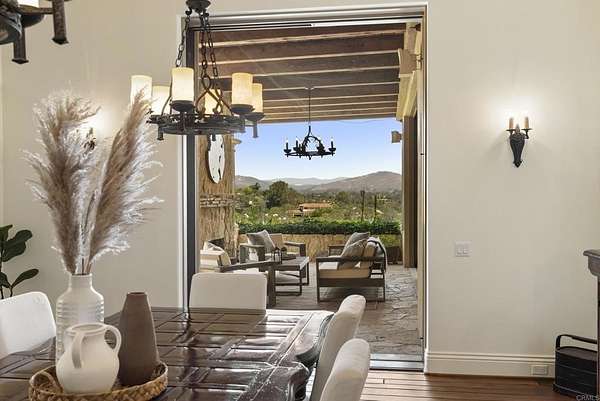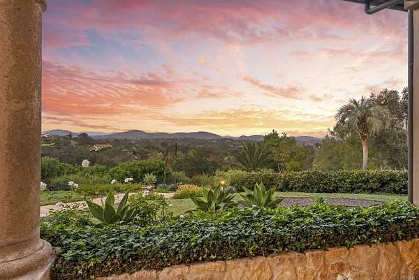 Est $53,712/mo- 9,703 sq. ft. | 5 BD + Office | 8 BA | 4.78 acres · Custom single-level · Panoramic mountain views · Oversized 4-car garage · Detached 1BD/1BA guest house · Beach-entry pool + cabana with fireplace · New pickleball court · Home theater · Wine cellar · Gourmet kitchen · Owned solar · Gated entry Tucked behind mature landscaping along an extended gated drive, this single-level, 9,700+ SqFt west Covenant estate sits on 4.78 acres, elevated to capture sweeping mountain views while maintaining a genuine sense of privacy and calm. The location is among the most coveted in the Covenant — just minutes to the Village, the Rancho Santa Fe Golf Club, and with easy access to the coast and I-5. Originally inspired by a European countryside retreat, the home has been completely and thoughtfully refreshed — honoring its original character while embracing a more open, livable feel. Stone accents, beamed ceilings, wide plank wood floors, and a seamless indoor/outdoor connection form the foundation of the design and carry throughout every space. Capitalizing on its premium single-level, indoor-outdoor design, the layout is both refined and easy to navigate. The kitchen — anchored by an oversized island, dual sinks, and generous prep space — flows naturally into the great room and dining area, with multiple lift-and-slide doors extending the living space outward to the covered outdoor areas. Panoramic mountain views are present throughout, quietly framing every gathering and everyday moment alike. The floor plan is as functional as it is well-appointed — four en-suite bedrooms, a dedicated office with its own half bath, a spacious media room, and a temperature-controlled walk-in wine room offer a versatile range of spaces for both daily living and entertaining. The primary suite is intentionally set apart from the main living areas, offering a private retreat with a natural connection to the surrounding landscape. Outside, the property opens into a true lifestyle setting. A beach-entry pool and spa serviced by a full pool bath, a covered loggia, and an outdoor living room with fireplace create multiple inviting areas to gather and unwind. A detached guest house — with a bedroom, full bath featuring a separate tub and shower, and large closet — provides a charming and comfortable space for visitors. A newly added pickleball court anchors the lower grounds, and the expansive acreage offers endless potential — room for a full-size soccer field, basketball, or whatever the next chapter calls for. An oversized 4-car garage and owned solar complete an offering that is genuinely difficult to match.