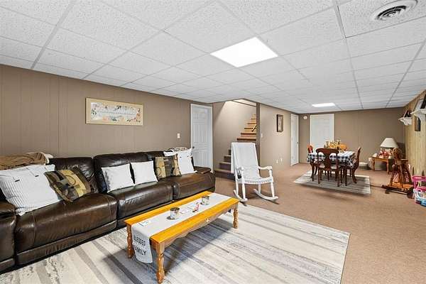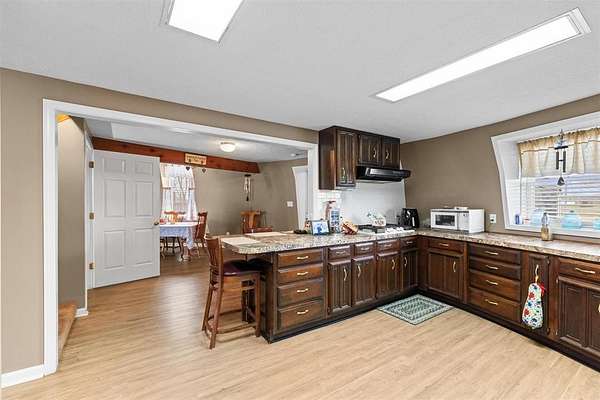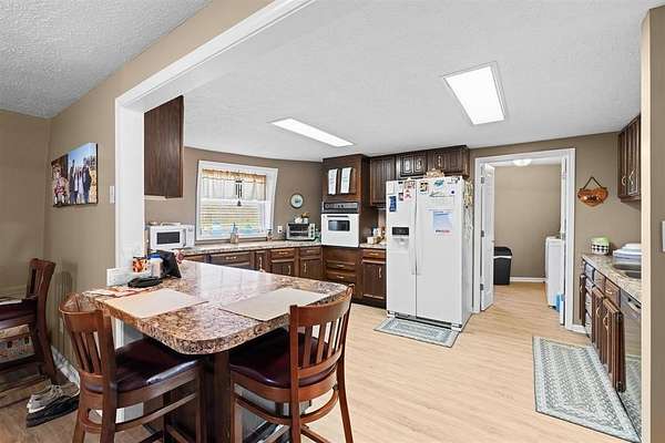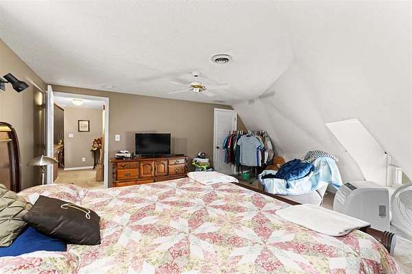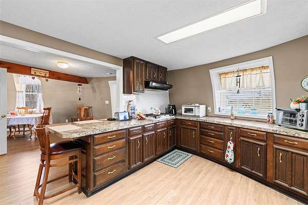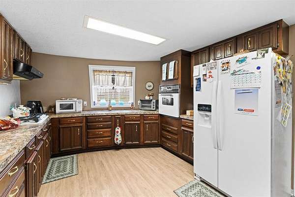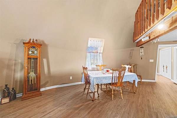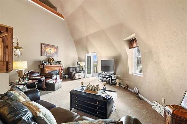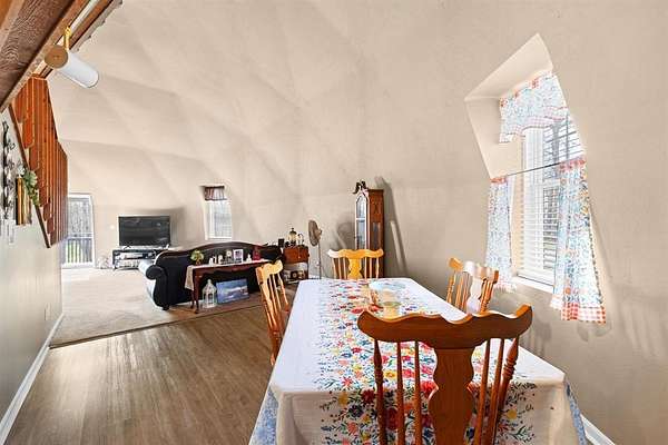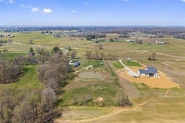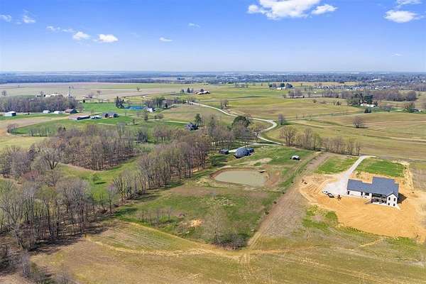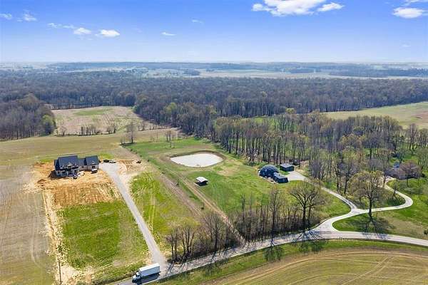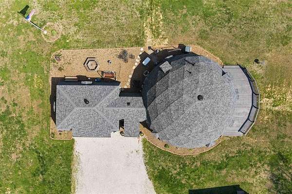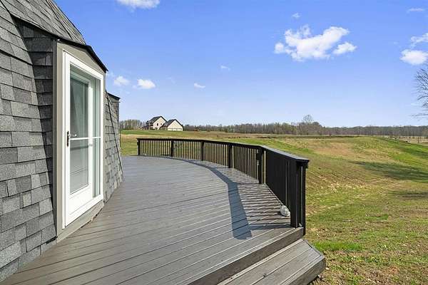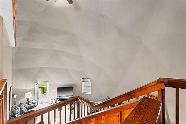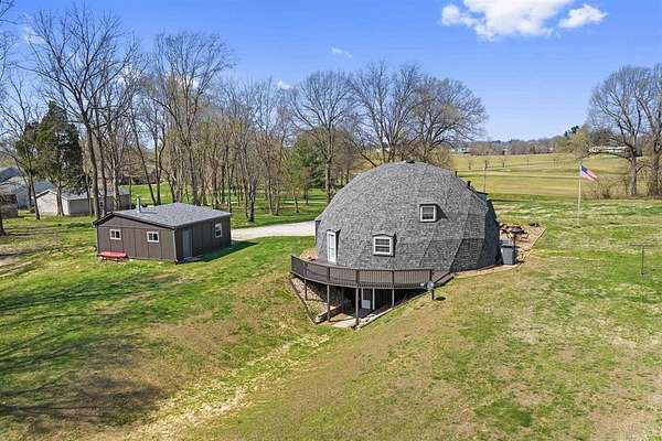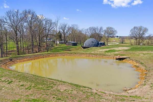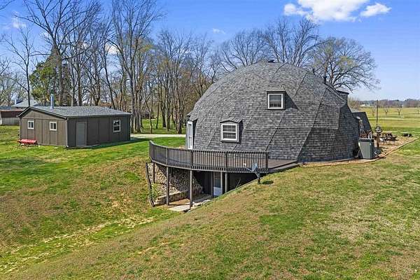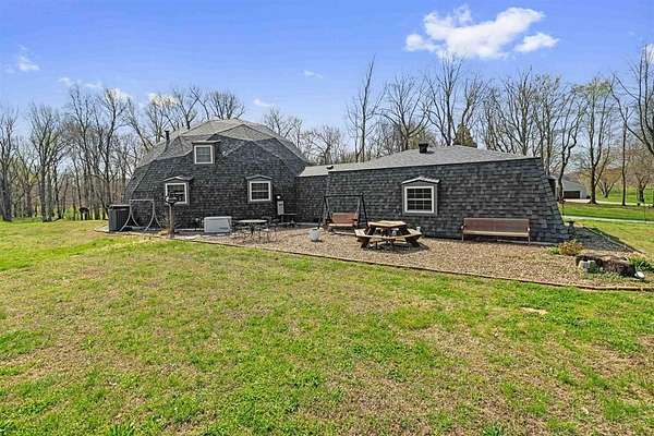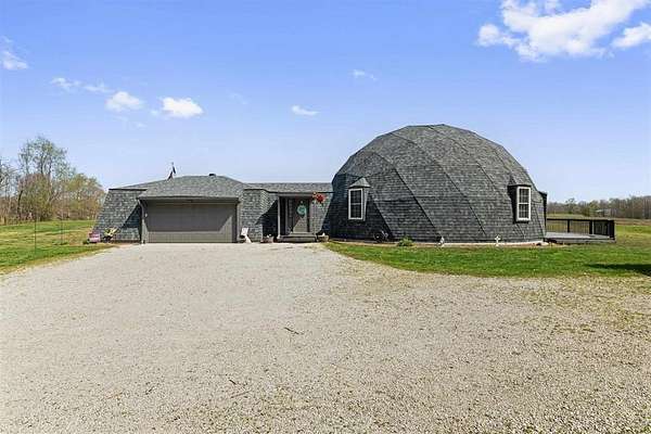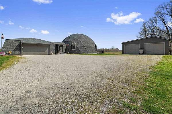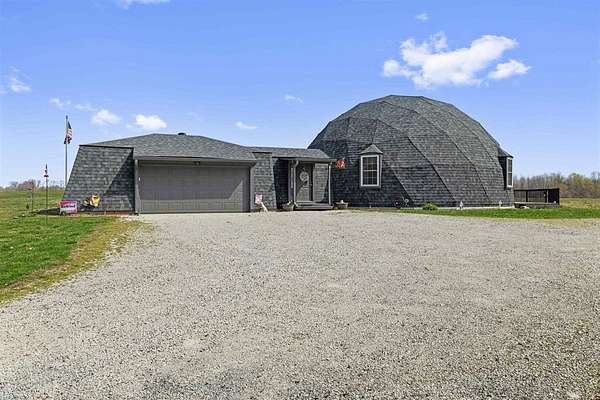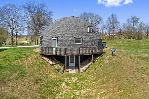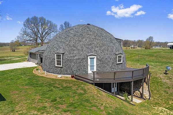 Welcome to one of the most unique homes in East Daviess County! This geodesic dome home sits on 5.36 beautiful acres and offers over 4,000 square feet of space designed for both comfort and durability. The dome structure, made up of a series of interlocking triangles connected by a metal frame, is known for its strength and durability because of it's ability to allow wind and weather to move around the home, making it one of the most structurally sound designs available. Inside, you’ll find a warm and inviting interior highlighted by stunning cedar wood accents and the striking igloo-style dome ceiling that creates a truly one-of-a-kind living space. Like seriously, One-of-a Kind. The home features 3 bedrooms and 2 bathrooms, with the primary suite located on the main level and the 2 existing bedrooms upstairs. The full walkout basement offers electrical already in place for two potential additional bedrooms, providing excellent opportunity for expansion without much work. Designed with space in mind, the home includes two living rooms plus an additional sitting area overlooking the interior of the home. The layout is perfect for entertaining or simply spreading out and enjoying the space. Outside, the property features a beautiful half-acre stocked pond filled with catfish and bluegill, a whole-house Generac generator, a 2-car oversized attached garage, and an additional 2-car detached garage for plenty of storage and workspace. You'll also find 2 pecan and 2 apple trees along, and you can't miss all the hummingbirds that come to visit! Located just minutes from town while still offering privacy and peaceful country living, this entire property is such a rare find!