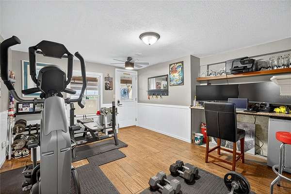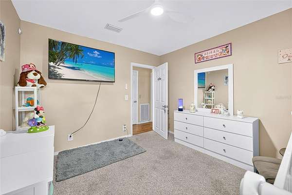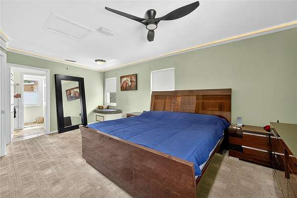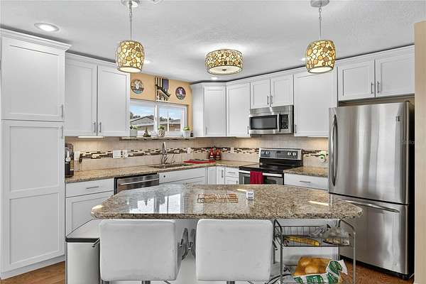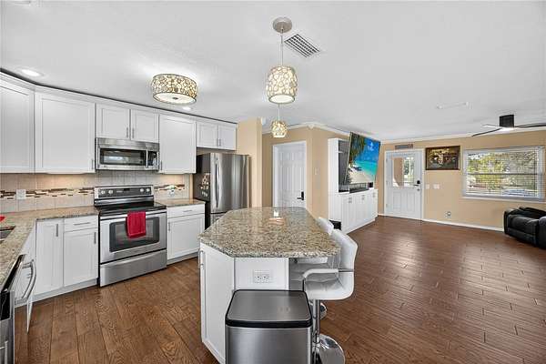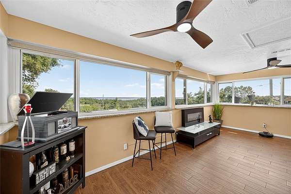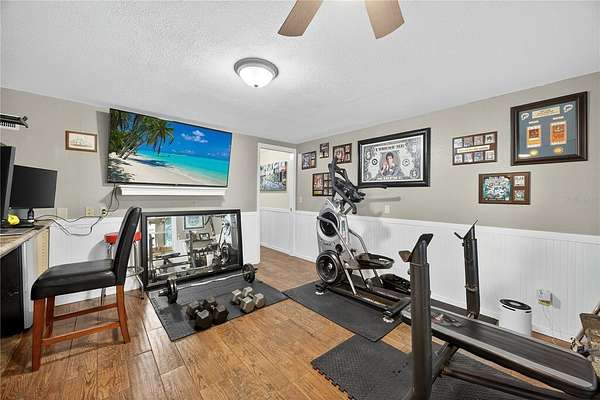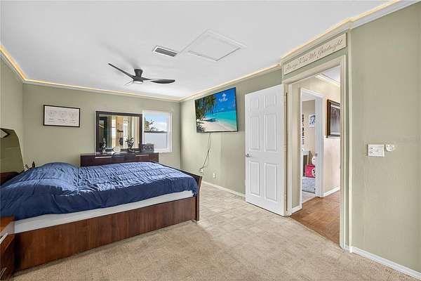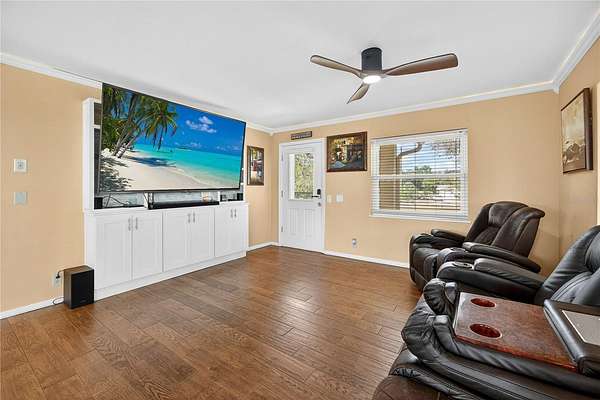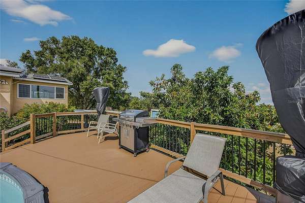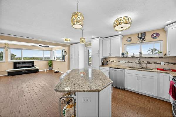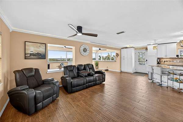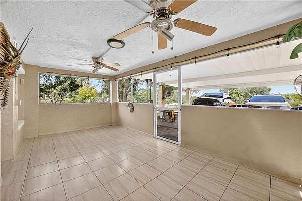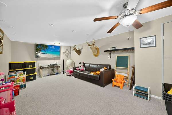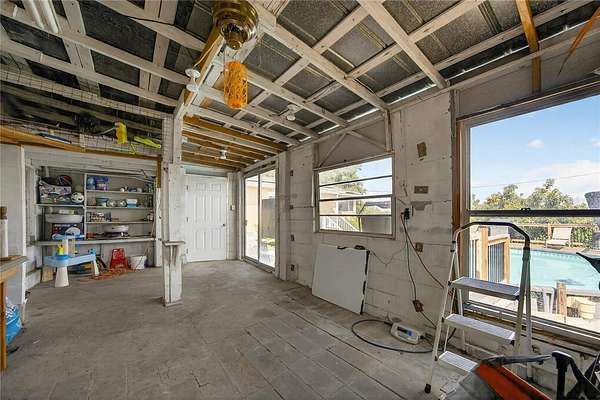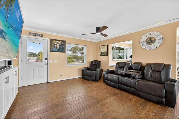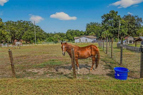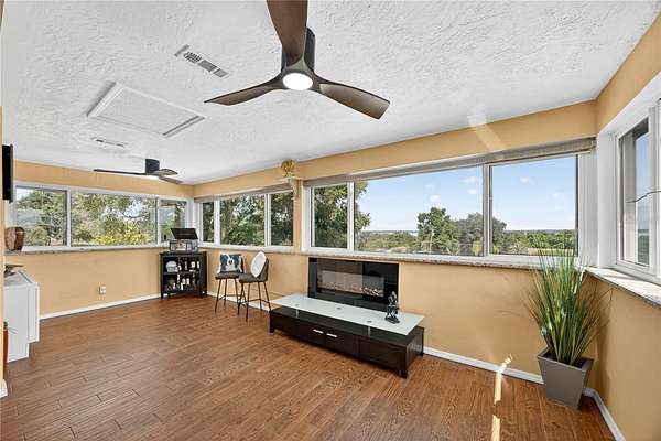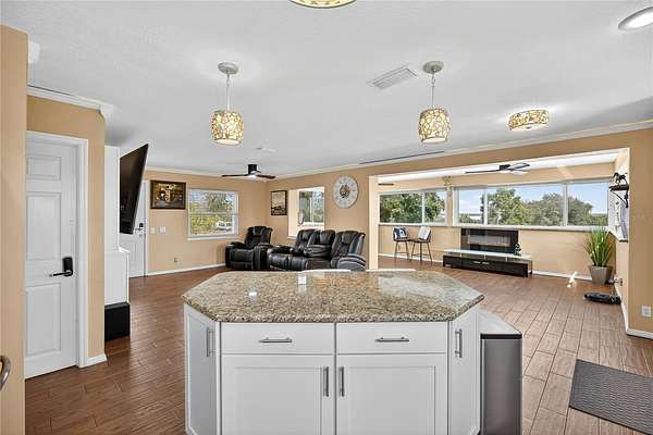 Tucked away on a quiet dead-end street in Lady Lake, this spacious 3-bedroom, 3.5-bath home is loaded with features you won't find anywhere else. Inside, you'll find multiple living spaces designed for both comfort and creativity: a large office/bonus room, oversized media room, guest suite, safe room, and a massive laundry/utility area. Upstairs, the heart of the home opens wide--an updated kitchen with granite counters, stainless appliances, island bar, and modern lighting flows seamlessly into the dining and family room, where walls of windows frame breathtaking views of Lake Griffin. The master suite offers built-in bench seating, a walk-in closet, and a spa-inspired bath with dual sinks, solar tube, and a glass shower. Step outside and discover everything this fully fenced 2-acre parcel has to offer: a detached workshop/garage, newer saltwater pool with new sand filter and new composite deck, RV hookup, fenced pasture with barn, chicken coop, plus fruit-bearing avocado and peach trees. Thoughtful upgrades include 30 solar panels for lower electric bills, crown molding, 6 camera CC TV System with phone monitoring, 2024 water heater with WIFI, wood plank tile, accent ceiling lighting, wainscoting panels, an oversized paved driveway with shaded carport, and a whole house water filter. No HOA. Endless potential. The perfect blend of privacy, self-sufficiency, and lakeside living.