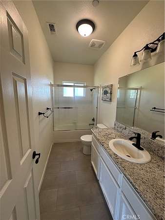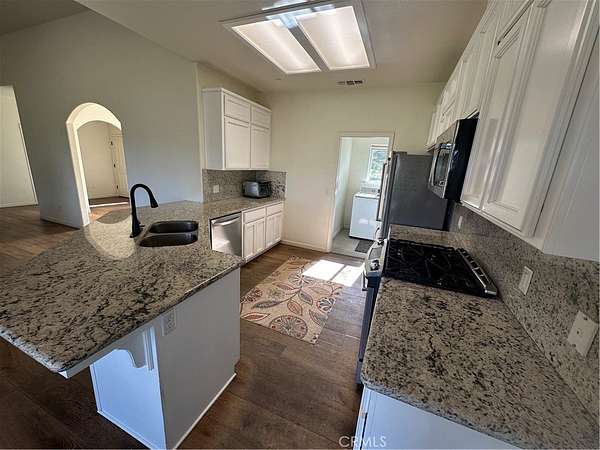 The nearly 2,000 sq. ft. home features 3 bedrooms and 2 bathrooms, with engineered hardwood flooring throughout most of the living space, complemented by ceramic tile in the entry and bathrooms. The spacious kitchen is designed for both style and function, showcasing gorgeous granite countertops and ample workspace. A durable stucco exterior and composition roof add to the home’s low-maintenance appeal. Also, the home has solar and is owned, no lease!