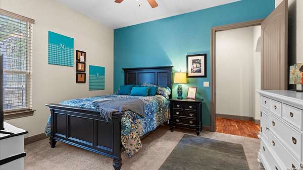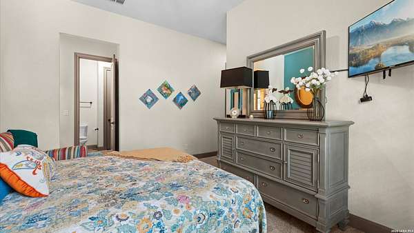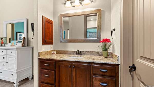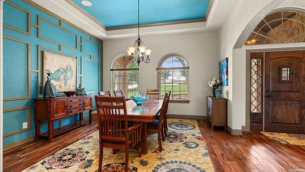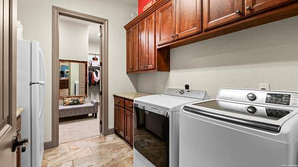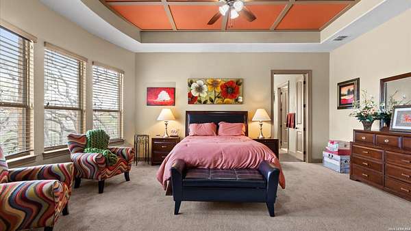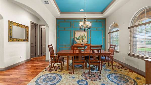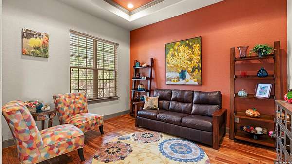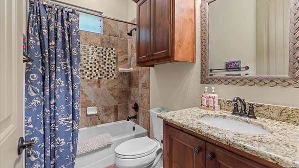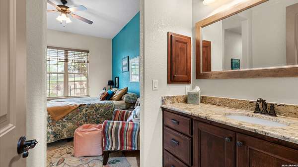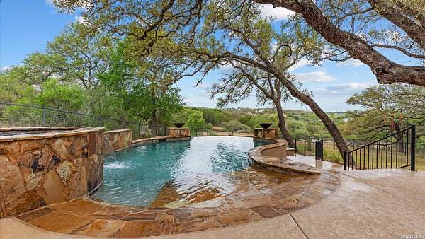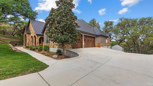 Stunning custom Hill Country estate in the highly sought-after River Chase community, perfectly situated on 2.63 private, oak-studded acres. This beautifully designed single-story home offers 3 bedrooms, 3 full baths, a half bath, and two spacious living areas, including a formal sitting area, across 3,442 square feet of thoughtfully crafted living space. From the moment you arrive, the striking stone exterior, arched entry, and metal roof set the tone for timeless quality and craftsmanship. Inside, warm wood flooring, architectural details, and an inviting stone fireplace create a welcoming yet refined atmosphere. The open-concept layout is ideal for both everyday living and entertaining, with multiple living spaces offering flexibility for gathering, relaxing, or working from home. The well-appointed kitchen features custom cabinetry, granite countertops, and designer finishes. The private primary suite is a true retreat, featuring a dedicated sitting area and a spa-like bath with soaking tub, walk-in shower, and generous closet space. Secondary bedrooms are well-sized with access to beautifully finished baths. Step outside to your own Hill Country oasis-an expansive covered patio overlooking a resort-style pool with water features, surrounded by mature trees and scenic views. Whether hosting guests or enjoying a quiet evening, this outdoor space delivers exceptional privacy and tranquility. A rare and highly desirable feature, the 18x50 detached workshop/RV garage is fully insulated and equipped with electricity and remote access-perfect for a workshop, recreational vehicles, or additional storage. The property also includes an attached garage, offering both convenience and versatility. Located in River Chase, residents enjoy exclusive access to premier amenities including a private Guadalupe River park, clubhouse, fitness center, and scenic walking trails-all just minutes from shopping, dining, and the charm of New Braunfels. A rare opportunity to own a private, amenity-rich estate that combines luxury, functionality, and the best of Hill Country living.