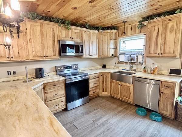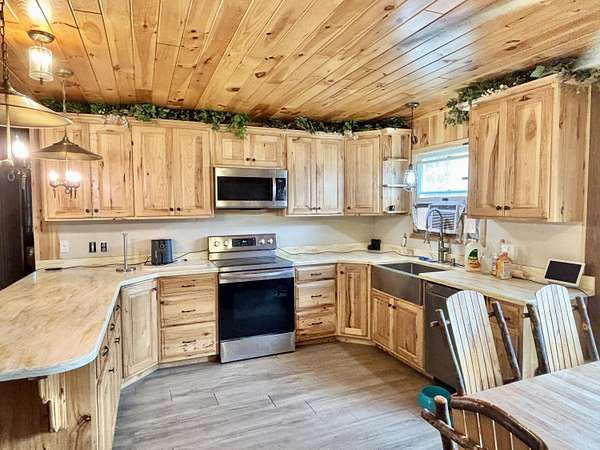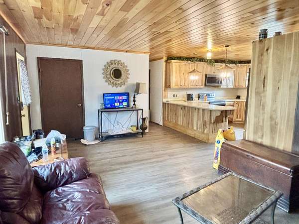Ranch home on 1.83 acres in LEWISTON - This cozy 3 bedroom 2 full bath home is setting nicely on 2 large lots not far from town. It has a gorgeous kitchen featuring high quality Amish built cabinets and Corian countertops. Kitchen has nice sized dining area and is also open to the spacious living room and fireplace. Storage is no problem with the attached 2 car garage, small shed, and huge pole barn w/newer attached lean-to. New septic 5 yrs ago, electrical was updated in house & pole barn & Generac was installed, just needs to be hooked up. Natural gas, and there is a central a/c unit ready to be installed. Lewiston schools, paved, maintained road, & close to all of town's amenities, incl ORV trail just across the road, & many lakes nearby. A great yr-round home or adventure base camp!