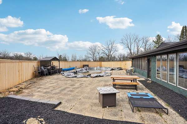 Welcome to your private oasis! Stunning, completely updated ranch on 2+ acres w/inground pool & dream 5+ car garage! Over 2 acres of serene land offering the perfect blend of modern comfort & country charm. Bright, open layout featuring 4 spacious bedrooms, 2 bathrooms & laundry! Gorgeous kitchen w/GE Cafe appliances, quartz countertops+sink, work island, wine bar, pantry, dinette area+formal dining room! Great room w/vaulted cedar ceiling, floating entertainment center & surround sound! Primary Suite w/massive walk-in closet featuring PAX wardrobe system & full bath! Enjoy year-round relaxation in the sun room, or unwind in the 3-season room overlooking your expansive property. The backyard is an entertainer’s dream—featuring a sparkling inground pool & plenty of space for gatherings, play or peaceful evenings under the stars. Car enthusiasts, hobbyists or anyone needing extra storage will love the impressive 5+ car garage! Both the front & backyard are fully fenced in! New roof-2024!