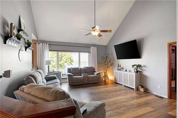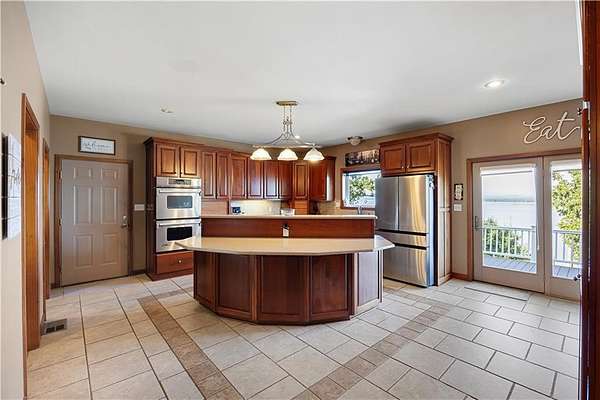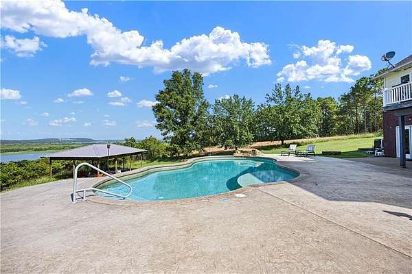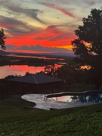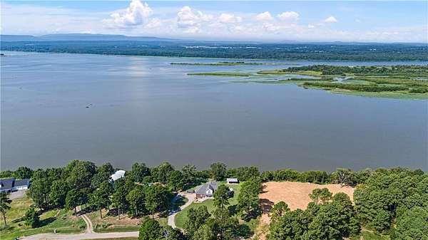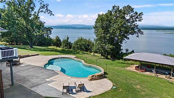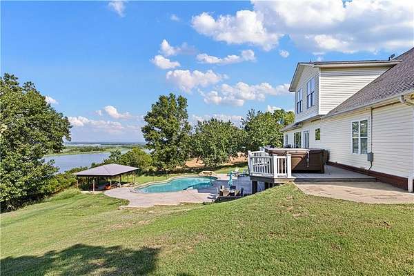 POWERFUL PRESENCE--stunning, cliff top dwelling overlooking the Arkansas River! CUSTOM BUILT home offers sweeping views, waterfront ambience, and golden sunsets. Well-designed aesthetics have maximized its location as a water front domain. Main level offers huge windows and new flooring throughout. Formal dining room, additional coffee bar, massive office with built ins, well-designed kitchen w/ bar, 1 of 2 living rooms are also on main level. Exceptional view of the water from the primary suite--offers a room that is the walk in closet plus an extremely spacious bathroom. Downstairs offers a huge living room plus game/exercise room, bedroom, laundry room, bonus rooms. Walk out to the self-cleaning, saltwater pool with water fall. Extra pavilion for entertaining.
