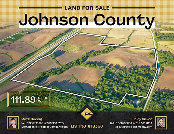 Peoples Company is pleased to welcome you to this quiet retreat just outside of Iowa City, Iowa. Located minutes from the busy streets of Iowa City lies the 111.89-acre combination farm that has been in the same family for over 50 years. It offers a variety of opportunities, including trail systems, wildlife, and a premier building site opportunity with income-producing row crop acres. Please reach out to the listing agents to schedule a showing. Don't miss this opportunity to own a premier property with country living & city amenities.