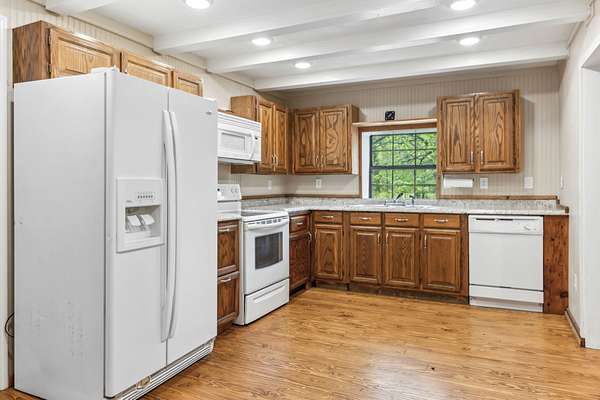 There are acres of flat pasture with a pond and wooded acres. Perfect paradise with tons of wildlife including turkeys and deer frequenting the yard. There is also a small concrete barn. .