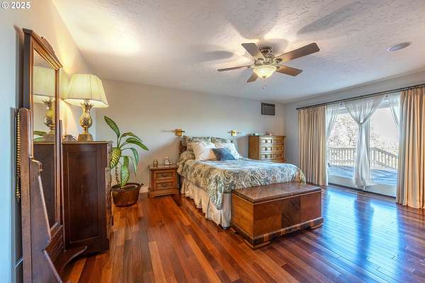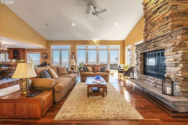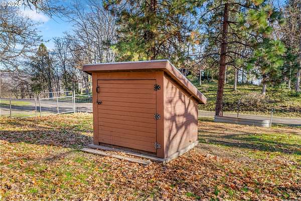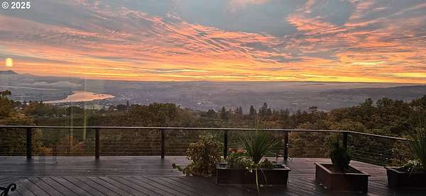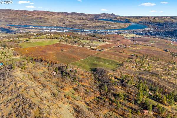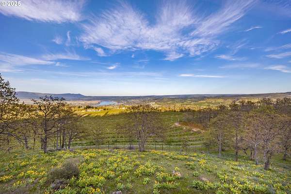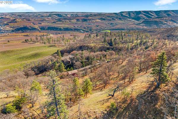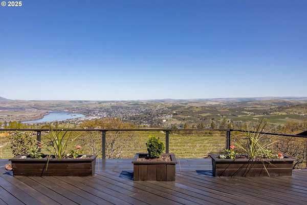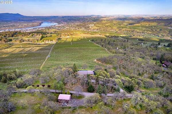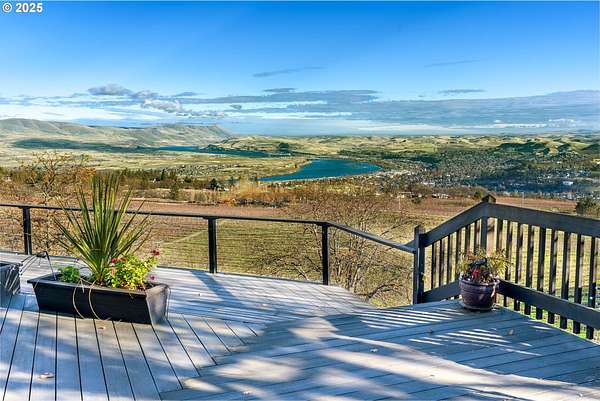 Located within the Columbia Gorge Scenic Area, this stunning property in The Dalles spans 9.13 acres with a panoramic view of the Columbia River Gorge, Washington hills and city lights of The Dalles. The 2,140 sq ft, single level home features 3 bedrooms, 2 bathrooms with hard surface countertops in the kitchen and ample cabinet storage. The dining and living room boast beautiful views of the river and Gorge and access an expansive deck. Meticulously maintained, this home showcases pride of ownership. This acreage property includes an attached 2-car garage with built-in cabinets for optimal storage as well as a detached 2-car garage along the paved, LED-lit driveway. Additionally, there is a private road that winds through a portion of the property with a large outbuilding. The septic tank was replaced in early 2024.