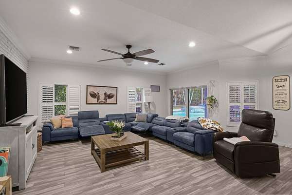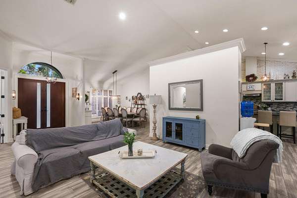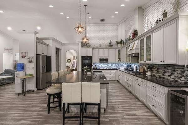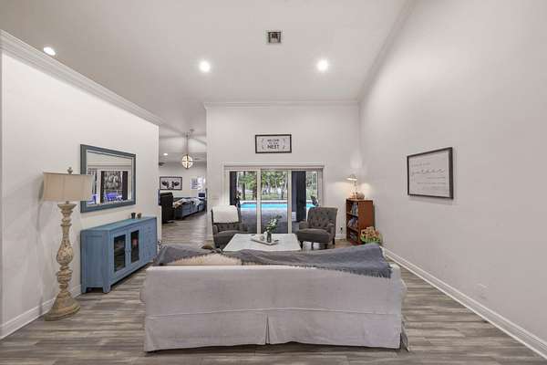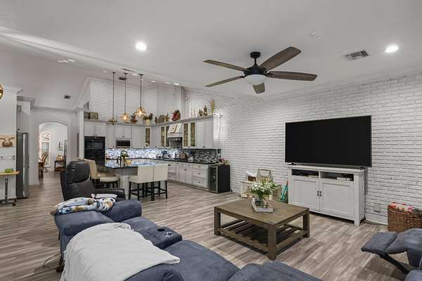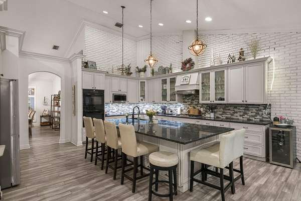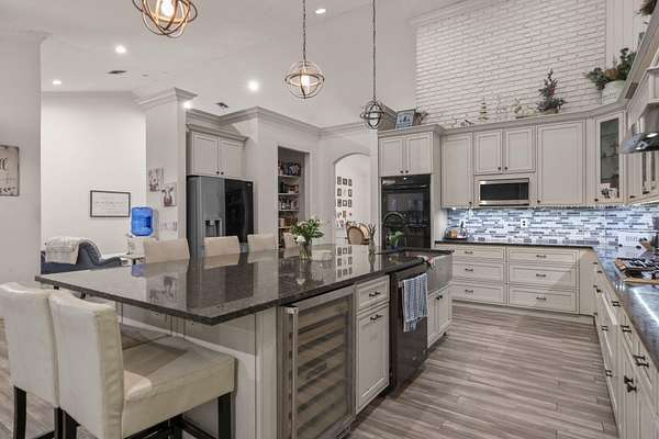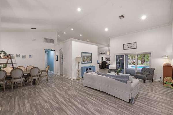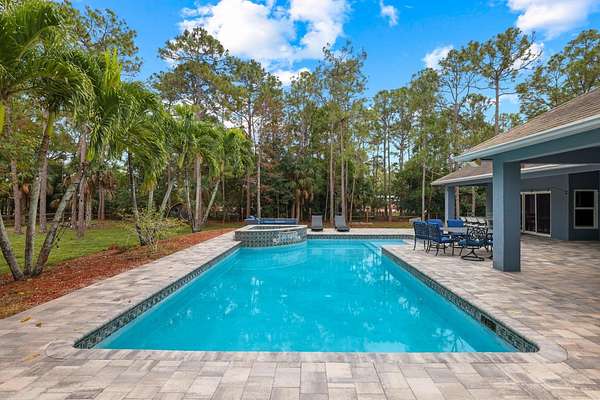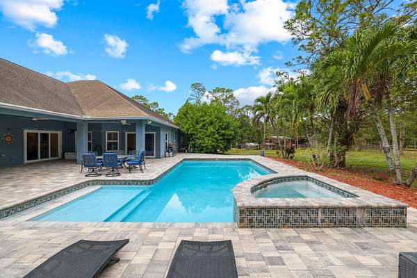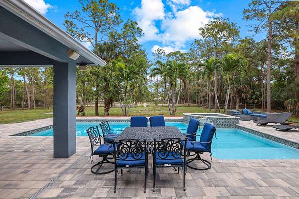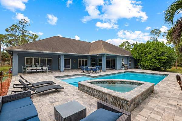 Set behind a guard gate within the sought-after equestrian enclave of Homeland, this private 5-acre estate delivers the perfect blend of refined living and equestrian functionality. The fully fenced property is entered through a motorized gate and features a solid CBS residence offering five bedrooms, three bathrooms, a den, and a thoughtfully designed split-bedroom layout.The home was tastefully updated in 2020, including a contemporary kitchen with upgraded cabinetry, stainless steel appliances, a gas cooktop, and a built-in Viking wine cooler. The expansive primary suite showcases tray ceilings, direct lanai access, and a spa-inspired bath featuring a seamless glass walk-in shower, soaking tub, and dual vanities. Vaulted ceilings, plantation shutters, impact windows and doors,
