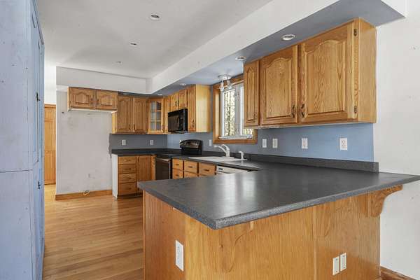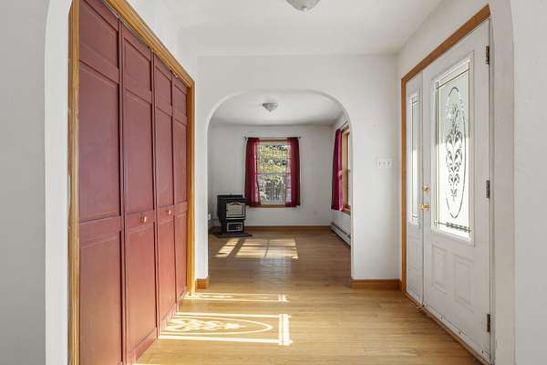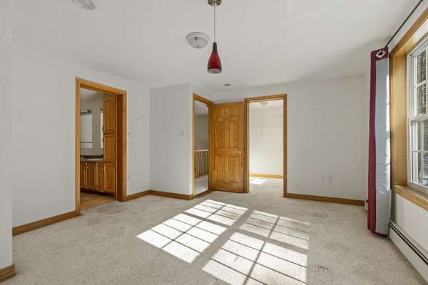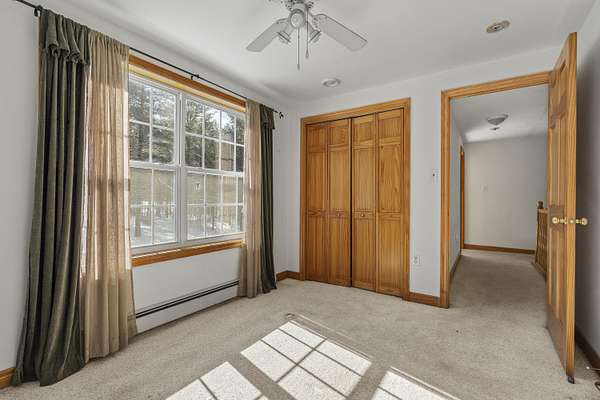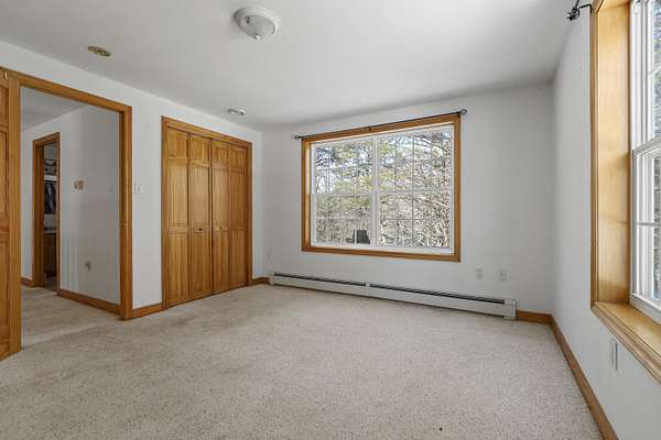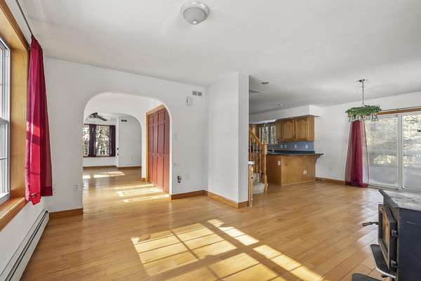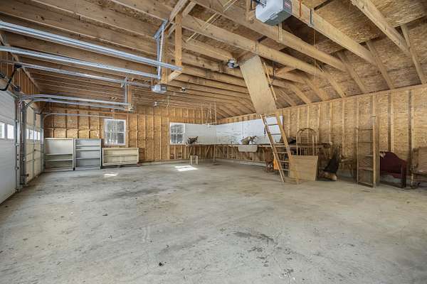 Set on four and a half scenic acres, this inviting family home offers privacy and space. Nestled among the pines at the end of a circular drive, the property features a two-story, three-bay garage and a welcoming home surrounded by nature's tranquility. The front entry opens to a comfortable split living area, with both a living room and family room for flexible use. A circular first-floor layout flows easily into the dining room and kitchen--ideal for family gatherings and entertaining. Sliding doors from the dining area lead to a back deck and a seasonal sunroom, perfect for relaxing on a warm summer evening. Upstairs, you'll find a spacious primary suite with two walk-in closets and a full bath, plus two additional bedrooms and another full bath. Each bedroom offers beautiful rural vistas. The full walkout basement includes workbenches and a wood stove for added warmth--perfect for hobbies or a workshop. The three-bay garage easily accommodates vehicles, tools, and toys, and its unfinished second floor offers even more potential for storage or future living space. Enjoy peace, privacy, and room to grow--all within a spectacular rural setting that truly feels like home. This home is winterized and being sold as is.