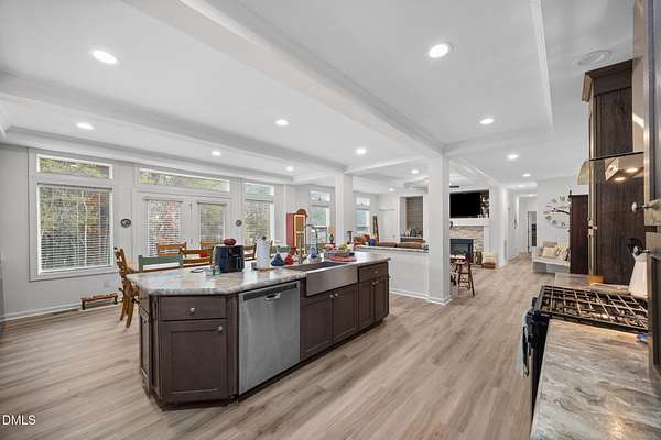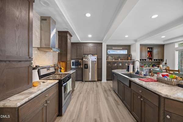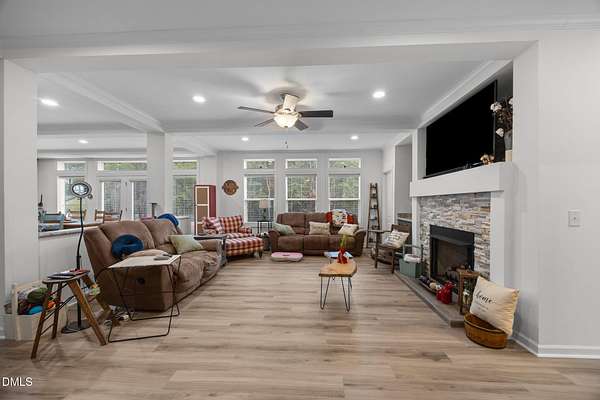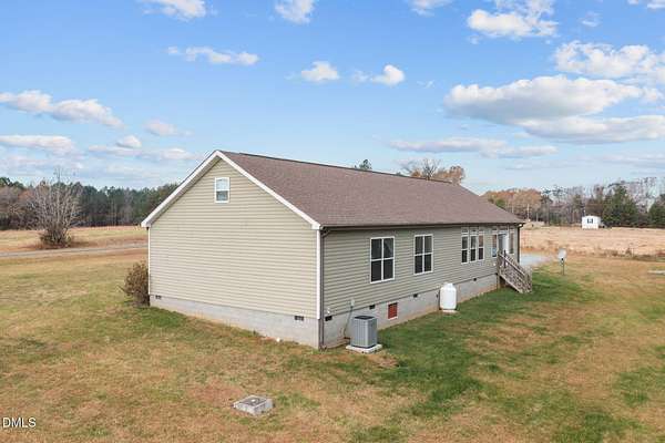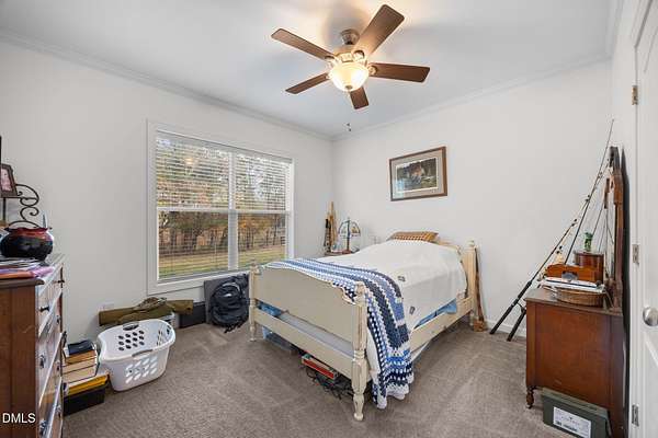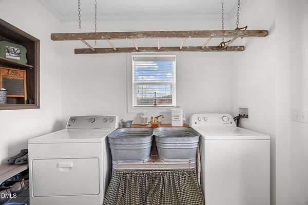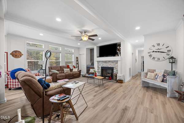 Peaceful country living meets thoughtful design in this stunning 3BR/2BA ranch on 1.67 beautiful acres in Burlington. Crown molding and double-pane windows with custom wood blinds run throughout. A welcoming foyer features a sliding barn door to a charming office with built-in cabinets and bench seating. The expansive open living area showcases a coffered 9' ceiling and a full wall of windows, flowing effortlessly between the cozy family room with decorative stone-surround gas log fireplace and built-ins, the dining area with built-in beverage bar and dedicated fridge, and the show-stopping kitchen. The kitchen offers tile backsplash, high-end stainless appliances (all remain), a wall of gorgeous built-ins, an oversized island with bar seating and farmhouse sink, plus an incredible walk-in pantry with additional built-in bar cabinetry. Just off the kitchen, you'll find an absolutely adorable laundry room that feels more like a finished space than a utility room. The spacious primary suite features a large, beautiful window, sliding barn door to an 8.5' walk-in closet, and spa-like bath with double vanity, oversized tiled walk-in shower with rain showerhead, and walk-in linen closet. Two additional bedrooms sit near a full hall bath. Permanent stairs lead to a 750 sq ft floored walk-in attic for exceptional storage. Enjoy the serene 18' covered front porch overlooking a picturesque pond across the street. This one is a true gem!