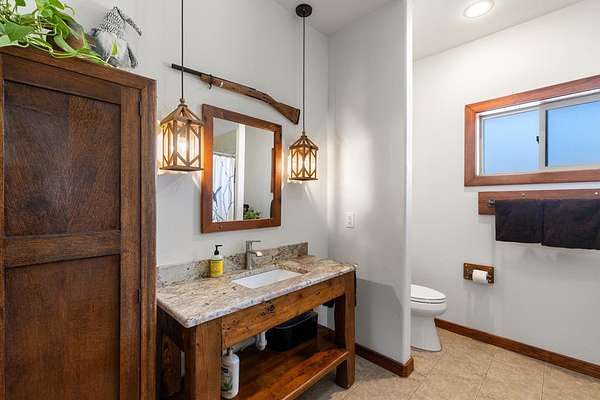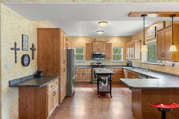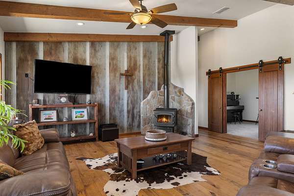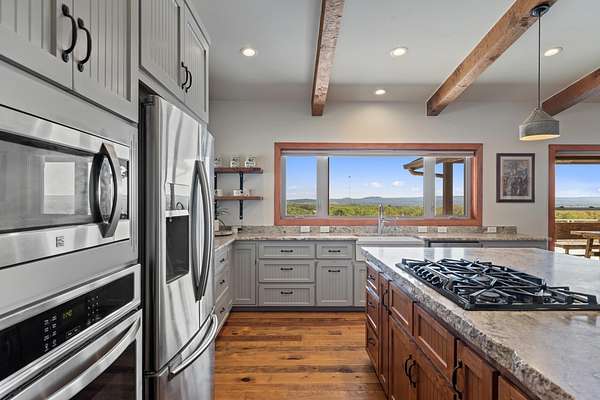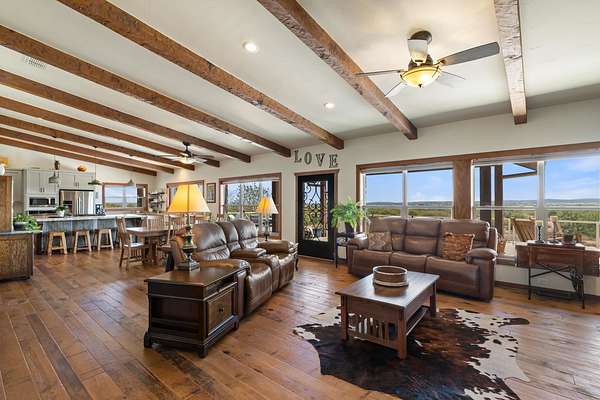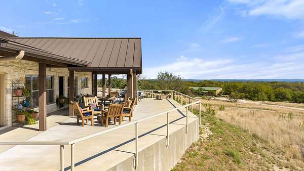 Experience luxury and wide-open Texas living on this exceptional 25-acre Ag-exempt property featuring two homes, extensive improvements, and panoramic views. The 2,206 sq ft main home offers 3 bedrooms and 2 baths with energy-efficient 2x6 construction, foam insulation, heat pump, central air, and wood stove. Vaulted ceilings and yellow pine floors highlight the kitchen, living area, and primary suite. The kitchen features a large live-edge granite island, custom cabinetry, and handcrafted woodwork throughout. The primary suite includes a double shower, and the home also offers an iron front door, restored mahogany doors, central vacuum, CAT5 wiring, and generator-ready setup. Enjoy a 1,700 sq ft porch with sweeping views. The 1,392 sq ft barndominium includes 2 bedrooms, 1 bath, full kitchen, and comes mostly furnished-ideal for guests or rental income. Additional features include a 1,547 sq ft heated hangar/shop with hydraulic door, half bath, and attic storage. Each home has its own septic system and shares a well, with propane, tankless water heaters, RO systems, and softeners. Property highlights include a private runway, horse facilities, barn, garden, orchards, and full fencing with gated entry and paved roads. Minimal restrictions offer flexibility and privacy.