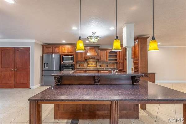 This is a one of a kind property. This can be a multi-family home, a single family home or an amazing vacation rental. Take your pick. There are 3 separate living areas. Two on the main level and one on the upper level. 2 full kitchens. One on the upper level and one in the main level, and a mini kitchen in the garage of the main level. 2 car attached garage and a 3 car detached garage with workshop area. This property also features a large pond with outbuilding overlooking and a bridge/dock area. There is a full time goose resident with its own living quarters in the pond. 2 gazebos overlooking the pond. This home has so many custom features, inlayed tile floors throughout the main level, custom exterior and security doors, one of a kind primary suite with walk-in shower and soaking tub, built-in cabinetry, solid wood interior doors, custom kitchen and so much more. There is also an elevator that makes this home handicap assessable. This home is beautiful the way it is, but could use some work and finishing touches, and is priced accordingly. Don't miss out on this spectacular property